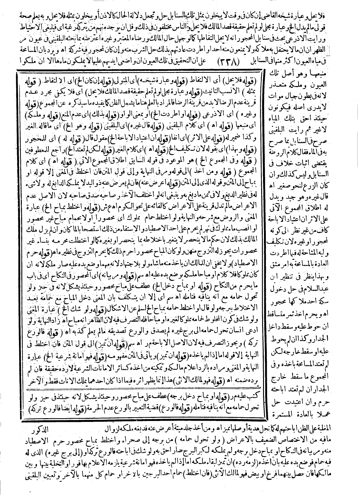 وَيُرَدُّ بِأَنَّ الْمُسَامَحَةَ فِي مِيَاهِ الْعُيُونِ أَكْثَرُ مِنْهَا فِي السَّنَابِلِ عَلَى أَنَّ التَّحْقِيقَ فِي تِلْكَ الْعُيُونِ أَنَّ وَاضِعِي أَيْدِيهِمْ عَلَيْهَا لَا يَمْلِكُونَ مَاءَهَا إلَّا إنْ مَلَكُوا مَنْبَعَهَا، وَهُوَ أَصْلُ تِلْكَ الْعُيُونِ، وَمِلْكُهُ مُتَعَذِّرٌ؛ لِأَنَّهُ فِي بُطُونِ جِبَالِ مَوَاتٍ لَا يُدْرَى أَصْلُهُ فَيَكُونُونَ حِينَئِذٍ أَحَقَّ بِتِلْكَ الْمِيَاهِ لَا غَيْرُ، ثُمَّ رَأَيْت الْبُلْقِينِيَّ صَرَّحَ فِي السَّنَابِلِ بِمَا صَرَّحَ بِهِ فِي الْمَاءِ فَقَالَ: كَلَامُ الرَّوْضَةِ يَقْتَضِي إثْبَاتَ خِلَافٍ فِي السَّنَابِلِ، وَلَيْسَ كَذَلِكَ، وَإِنْ كَانَ الزَّرْعُ لِنَحْوِ صَغِيرٍ. اهـ. قَالَ غَيْرُهُ وَهُوَ جَيِّدٌ، وَيَدُلُّ لَهُ إطْلَاقُ الْمَجْمُوعِ الْآتِي عَلَى الْأَثَرِ أَنَّ اعْتِيَادَ الْإِبَاحَةِ كَافٍ مِنْ غَيْرِ نَظَرٍ إلَى كَوْنِهِ لِمَحْجُورٍ، أَوْ غَيْرِهِ؛ لِأَنَّ تَكْلِيفَ، وَلِيِّهِ الْمُشَاحَةَ لَهُ فِيمَا اطَّرَدَتْ الْعَادَةُ بِالْمُسَامَحَةِ بِهِ أَمْرٌ مُشْقٍ، وَبِهَذَا يُنْظَرُ فِي تَنْظِيرِ ابْنِ عَبْدِ السَّلَامِ فِي حِلِّ دُخُولِ سِكَّةٍ أَحَدُ مُلَّاكِهَا مَحْجُورٌ. اهـ.