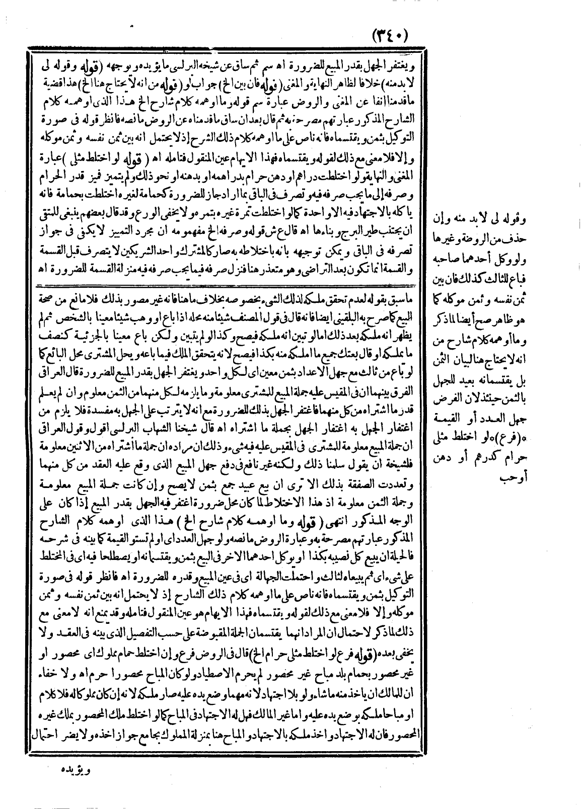 وَذَلِكَ أَنَّ مُرَادَهُ أَنَّ جُمْلَةَ مَا اشْتَرَاهُ مِنْ الِاثْنَيْنِ مَعْلُومَةٌ فَلِشَيْخِهِ أَنْ يَقُولَ: سَلَّمْنَا ذَلِكَ، وَلَكِنَّهُ غَيْرُ نَافِعٍ فِي دَفْعِ جَهْلِ الْمَبِيعِ الَّذِي، وَقَعَ عَلَيْهِ الْعَقْدُ مِنْ كُلٍّ مِنْهُمَا، وَتَعَدَّدَتْ الصَّفْقَةُ بِذَلِكَ أَلَا تَرَى أَنَّ بَيْعَ عَبِيدِ جَمْعٍ بِثَمَنٍ لَا يَصِحُّ، وَإِنْ كَانَتْ جُمْلَةُ الْمَبِيعِ مَعْلُومَةً، وَجُمْلَةُ الثَّمَنِ مَعْلُومَةً؛ إذْ هَذَا الِاخْتِلَاطُ لَمَّا كَانَ مَحَلَّ ضَرُورَةٍ اُغْتُفِرَ فِيهِ الْجَهْلُ بِقَدْرِ الْمَبِيعِ إذَا كَانَ عَلَى الْوَجْهِ الْمَذْكُورِ. اهـ. (قَوْلُهُ: وَمَا أَوْهَمَهُ كَلَامُ شَارِحٍ إلَخْ.) هَذَا الَّذِي أَوْهَمَهُ كَلَامُ الشَّارِحِ الْمَذْكُورِ عِبَارَتُهُمْ مُصَرِّحَةٌ بِهِ، وَعِبَارَةُ الرَّوْضِ مَا نَصُّهُ، وَلَوْ جُهِلَ الْعَدَدُ أَيْ: أَوْ لَمْ تَسْتَوِ الْقِيمَةُ كَمَا بَيَّنَهُ فِي شَرْحِهِ فَالْحِيلَةُ أَنْ يَبِيعَ كُلٌّ نَصِيبَهُ بِكَذَا، أَوْ يُوَكِّلَ أَحَدُهُمَا الْآخَرَ فِي الْبَيْعِ بِثَمَنٍ، وَيَقْتَسِمَاهُ، أَوْ يَصْطَلِحَا فِيهِ أَيْ: فِي الْمُخْتَلِطِ عَلَى شَيْءٍ أَيْ: ثُمَّ يَبِيعَاهُ لِثَالِثٍ، وَاحْتُمِلَتْ الْجَهَالَةُ أَيْ: فِي عَيْنِ الْمَبِيعِ وَقَدْرِهِ لِلضَّرُورَةِ. اهـ. فَانْظُرْ قَوْلَهُ فِي صُورَةِ التَّوْكِيلِ بِثَمَنٍ، وَيَقْتَسِمَاهُ فَإِنَّهُ نَاصٌّ عَلَى مَا أَوْهَمَهُ كَلَامُ ذَلِكَ الشَّارِحُ إذْ لَا يُحْتَمَلُ أَنَّهُ بَيَّنَ ثَمَنَ نَفْسِهِ وَثَمَنَ مُوَكِّلِهِ وَإِلَّا فَلَا مَعْنَى مَعَ ذَلِكَ لِقَوْلِهِ وَيَقْتَسِمَاهُ فَهَذَا الْإِيهَامُ هُوَ عَيْنُ الْمَنْقُولِ فَتَأَمَّلْهُ، وَقَدْ يَمْنَعُ أَنَّهُ لَا مَعْنَى مَعَ ذَلِكَ لِمَا ذُكِرَ لِاحْتِمَالِ أَنَّ الْمُرَادَ أَنَّهُمَا يَقْتَسِمَانِ الْجُمْلَةَ الْمَقْبُوضَةَ عَلَى حَسَبِ التَّفْصِيلِ الَّذِي بَيَّنَهُ فِي الْعَقْدِ، وَلَا يَخْفَى بُعْدُهُ
