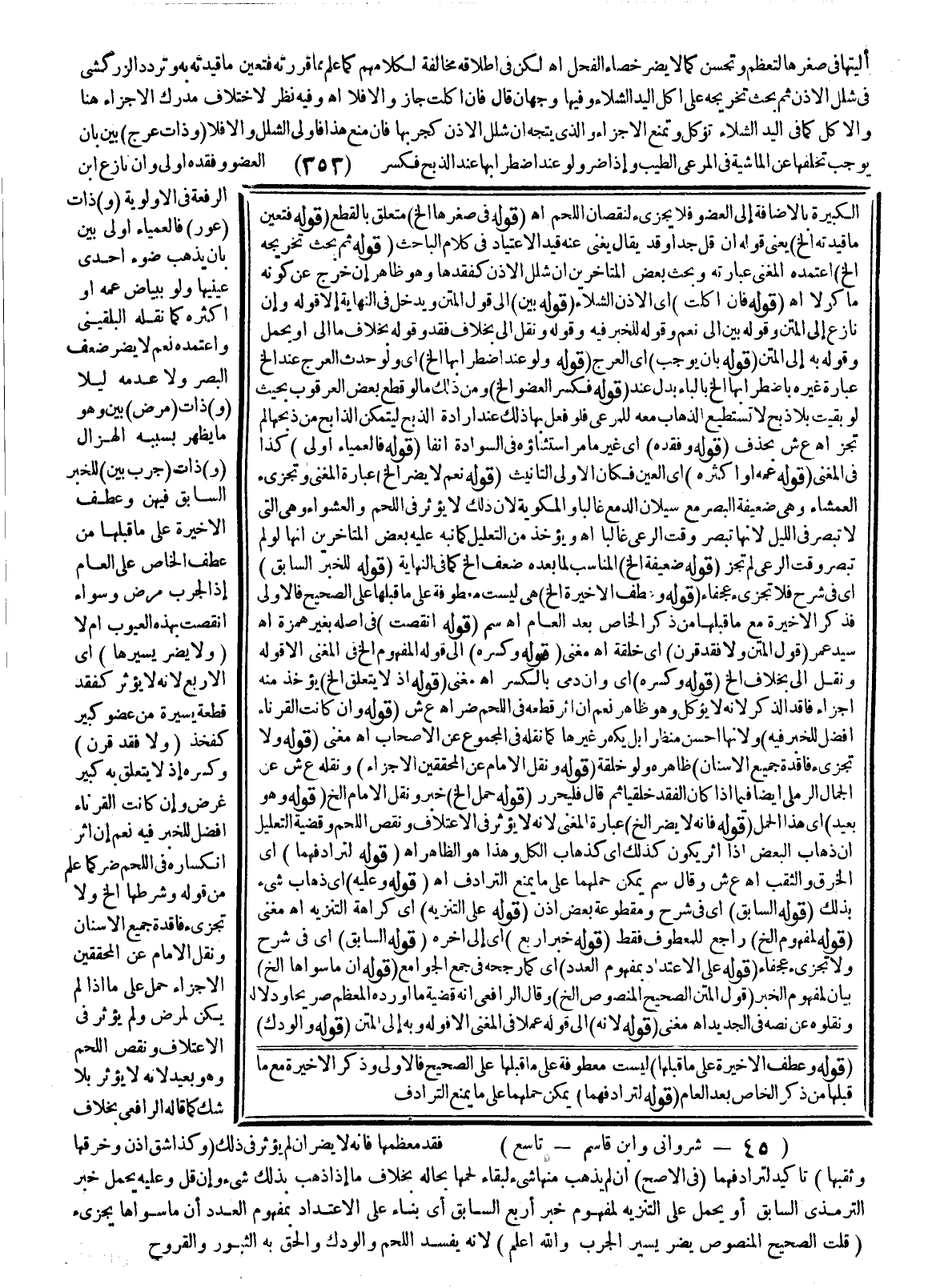 وَاَلَّذِي يُتَّجَهُ أَنَّ شَلَلَ الْأُذُنِ كَجَرَبِهَا فَإِنْ مَنَعَ هَذَا فَأَوْلَى الشَّلَلُ وَإِلَّا فَلَا (وَذَاتُ عَرَجٍ) بَيِّنٍ بِأَنْ يُوجِبَ تَخَلُّفَهَا عَنْ الْمَاشِيَةِ فِي الْمَرْعَى الطَّيِّبِ وَإِذَا ضَرَّ وَلَوْ عِنْدَ اضْطِرَابِهَا عِنْدَ الذَّبْحِ فَكَسْرُ الْعُضْوِ وَفَقْدُهُ أَوْلَى وَإِنْ نَازَعَ ابْنُ الرِّفْعَةِ فِي الْأَوْلَوِيَّةِ (وَ) ذَاتُ (عَوَرٍ) فَالْعَمْيَاءُ أَوْلَى بَيِّنٌ بِأَنْ يَذْهَبَ ضَوْءُ إحْدَى عَيْنَيْهَا وَلَوْ بِبَيَاضٍ عَمَّهُ أَوْ أَكْثَرَهُ كَمَا نَقَلَهُ الْبُلْقِينِيُّ وَاعْتَمَدَهُ نَعَمْ لَا يَضُرُّ ضَعْفُ الْبَصَرِ وَلَا عَدَمُهُ لَيْلًا (وَ) ذَاتُ (مَرَضٍ) بَيِّنٍ وَهُوَ مَا يَظْهَرُ بِسَبَبِهِ الْهُزَالُ (وَ) ذَاتُ (جَرَبٍ بَيِّنٍ) لِلْخَبَرِ السَّابِقِ فِيهِنَّ وَعَطْفُ الْأَخِيرَةِ عَلَى مَا قَبْلَهَا مِنْ عَطْفِ الْخَاصِّ عَلَى الْعَامِّ إذْ الْجَرَبُ مَرَضٌ وَسَوَاءٌ أَنَقَصَتْ بِهَذِهِ الْعُيُوبِ أَمْ لَا