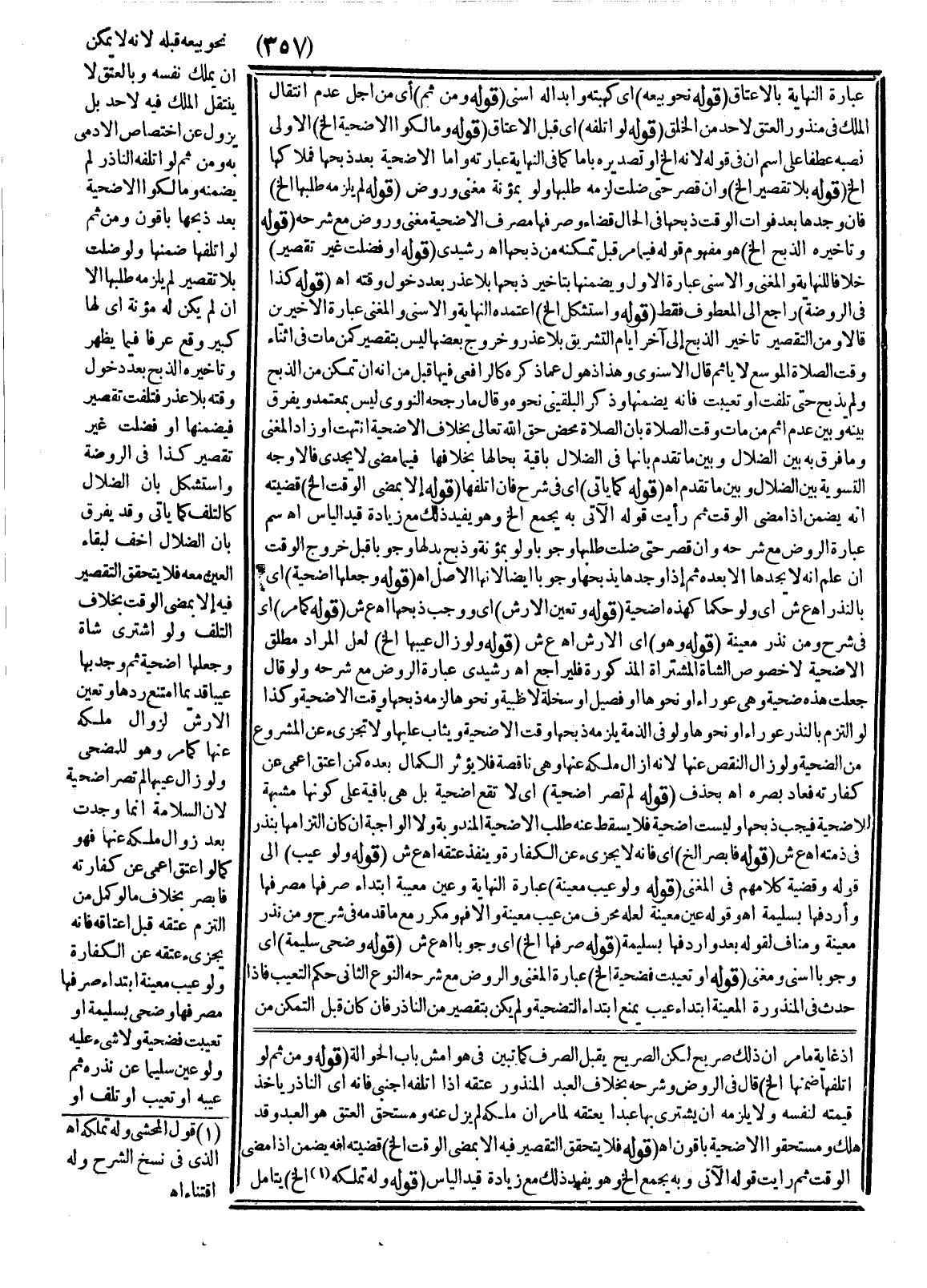 نَحْوُ بَيْعِهِ قَبْلَهُ لِأَنَّهُ لَا يُمْكِنُ أَنْ يَمْلِكَ نَفْسَهُ وَبِالْعِتْقِ لَا يَنْتَقِلُ الْمِلْكُ فِيهِ لِأَحَدٍ بَلْ يَزُولُ عَنْ اخْتِصَاصِ الْآدَمِيِّ بِهِ وَمِنْ ثَمَّ لَوْ أَتْلَفَهُ النَّاذِرُ لَمْ يَضْمَنْهُ وَمَالِكُو الْأُضْحِيَّةِ بَعْدَ ذَبْحِهَا بَاقُونَ وَمِنْ ثَمَّ لَوْ أَتْلَفَهَا ضَمِنَهَا وَلَوْ ضَلَّتْ بِلَا تَقْصِيرٍ لَمْ يَلْزَمْهُ طَلَبُهَا إلَّا إنْ لَمْ يَكُنْ لَهُ مُؤْنَةٌ أَيْ لَهَا كَبِيرُ وَقْعٍ عُرْفًا فِيمَا يَظْهَرُ وَتَأْخِيرُهُ الذَّبْحَ بَعْدَ دُخُولِ وَقْتِهِ بِلَا عُذْرٍ فَتَلِفَتْ تَقْصِيرٌ فَيَضْمَنُهَا أَوْ فَضَلَّتْ غَيْرُ تَقْصِيرٍ كَذَا فِي الرَّوْضَةِ وَاسْتَشْكَلَ بِأَنَّ الضَّلَالَ كَالتَّلَفِ كَمَا يَأْتِي وَقَدْ يُفَرَّقُ بِأَنَّ الضَّلَالَ أَخَفُّ لِبَقَاءِ الْعَيْنِ مَعَهُ فَلَا يَتَحَقَّقُ التَّقْصِيرُ فِيهِ إلَّا بِمُضِيِّ الْوَقْتِ بِخِلَافِ التَّلَفِ وَلَوْ اشْتَرَى شَاةً وَجَعَلَهَا أُضْحِيَّةً ثُمَّ وَجَدَ بِهَا عَيْبًا قَدِيمًا امْتَنَعَ رَدُّهَا وَتَعَيَّنَ الْأَرْشُ لِزَوَالِ مِلْكِهِ عَنْهَا كَمَا مَرَّ وَهُوَ لِلْمُضَحِّي وَلَوْ زَالَ عَيْبُهَا لَمْ تَصِرْ أُضْحِيَّةً؛ لِأَنَّ السَّلَامَةَ إنَّمَا وُجِدَتْ بَعْدَ زَوَالِ مِلْكِهِ عَنْهَا فَهُوَ كَمَا لَوْ أَعْتَقَ أَعْمَى عَنْ كَفَّارَتِهِ فَأَبْصَرَ بِخِلَافِ مَا لَوْ كَمُلَ مَنْ الْتَزَمَ عِتْقَهُ قَبْلَ إعْتَاقِهِ فَإِنَّهُ يُجْزِئُ عِتْقُهُ عَنْ الْكَفَّارَةِ