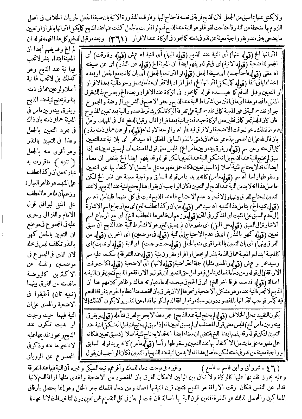 (تَنْبِيهٌ ثَانٍ) أَطْبَقُوا فِي الْأُضْحِيَّةِ وَالْهَدْيِ عَلَى أَنَّ النِّيَّةَ فِيهِمَا حَيْثُ وَجَبَتْ أَوْ نُدِبَتْ تَكُونُ عِنْدَ الذَّبْحِ وَيَجُوزُ تَقْدِيمُهَا عَلَيْهِ لَا تَأْخِيرُهَا عَنْهُ وَذَكَرَ فِي الْمَجْمُوعِ عَنْ الرُّويَانِيِّ وَغَيْرِهِ فِي مَبْحَثِ دِمَاءِ النُّسُكِ وَأَقَرَّهُمْ وَتَبِعَهُ السُّبْكِيُّ وَغَيْرُهُ أَنَّ النِّيَّةَ فِيهَا عِنْدَ التَّفْرِقَةِ وَعَلَيْهِ يَجُوزُ تَقْدِيمُهَا عَلَيْهَا كَالزَّكَاةِ وَلَا تَنَافِيَ بَيْنَ الْبَابَيْنِ لِإِمْكَانِ الْفَرْقِ بِأَنَّ الْمَقْصُودَ مِنْ الْأُضْحِيَّةِ - وَالْهَدْيُ مِثْلُهَا - إرَاقَةُ الدَّمِ لِأَنَّهَا فِدَاءٌ عَنْ النَّفْسِ فَكَانَ وَقْتُ الْإِرَاقَةِ هُوَ الذَّبْحُ فَتَعَيَّنَ قَرْنُ النِّيَّةِ بِهَا أَصَالَةً وَمِنْ دِمَاءِ النُّسُكِ جَبْرُ الْخَلَلِ وَهُوَ إنَّمَا يَحْصُلُ بِإِرْفَاقِ الْمَسَاكِينِ وَالْمُحَصِّلُ لِذَلِكَ هُوَ التَّفْرِقَةُ فَتَعَيَّنَ قَرْنُ النِّيَّةِ بِهَا أَصَالَةً فَإِنْ قُلْت لِمَ جَازَ فِي كُلٍّ التَّقْدِيمُ عَمَّا تَعَيَّنَ دُونَ التَّأْخِيرِ فَمَاتَ لِأَنَّا عَهِدْنَا