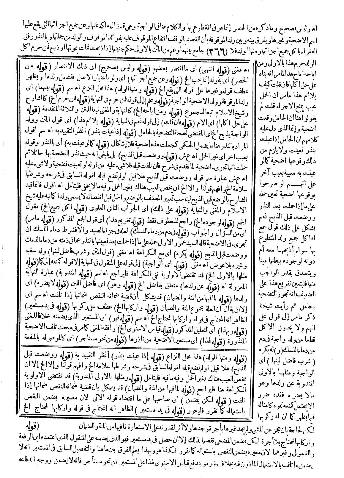 اهـ. وَلَيْسَ بِصَحِيحٍ وَمَا ذَكَرَهُ مِنْ الْحَصْرِ إنَّمَا هُوَ فِي الْمُتَطَوِّعِ بِهَا وَالْكَلَامُ هُنَا فِي الْوَاجِبَةِ وَهِيَ قَدْ زَالَ مِلْكُهُ عَنْهَا وَعَنْ جَمِيعِ أَجْزَائِهَا الَّتِي يَقَعُ عَلَيْهَا اسْمُ الْأُضْحِيَّةِ وَغَيْرِهَا وَيُفَرَّقُ بَيْنَهُ وَبَيْنَ وَلَدِ الْمَوْقُوفَةِ بِأَنَّ الْقَصْدَ بِالْوَقْفِ انْتِفَاعُ الْمَوْقُوفِ عَلَيْهِ بِفَوَائِدِ الْمَوْقُوفِ وَالْوَلَدُ مِنْ جُمْلَتِهَا وَبِالنَّذْرِ رَفَقَ الْفُقَرَاءُ بِأَكْلِ جَمِيعِ أَجْزَائِهَا وَمِنْهَا الْوَلَدُ فَلَا جَامِعَ بَيْنَهُمَا وَعُلِمَ مِنْ الْمَتْنِ بِالْأَوْلَى حُكْمُ جَنِينِهَا إذَا ذُبِحَتْ فَمَاتَ بِمَوْتِهَا أَوْ ذُبِحَ فَمَنْ حَرَّمَ أَكْلَ الْوَلَدِ حَرَّمَ هَذَا بِالْأَوْلَى وَمَنْ أَبَاحَهُ أَبَاحَ هَذَا لِمَا مَرَّ أَنَّهُ بِنَاءٌ عَلَى حِلِّ أَكْلِهَا فَإِنْ قُلْت كَيْفَ يُلَائِمُ هَذَا مَا مَرَّ أَنَّ الْحَمْلَ عَيْبٌ يَمْنَعُ الْإِجْزَاءَ قُلْت لَمْ يَقُولُوا هُنَا إنَّ الْحَامِلَ وَقَعَتْ أُضْحِيَّةً وَإِنَّمَا الَّذِي دَلَّ عَلَيْهِ كَلَامُهُمْ أَنَّ الْحَامِلَ إذَا عُيِّنَتْ بِنَذْرٍ تَعَيَّنَتْ وَلَا يَلْزَمُ مِنْ ذَلِكَ وُقُوعُهَا أُضْحِيَّةً كَمَا لَوْ عُيِّنَتْ بِهِ مَعِيبَةً بِعَيْبٍ آخَرَ عَلَى أَنَّهُمْ لَوْ صَرَّحُوا بِوُقُوعِهَا أُضْحِيَّةً تَعَيَّنَ حَمْلُهُ عَلَى مَا إذَا حَمَلَتْ بَعْدَ النَّذْرِ وَوَضَعَتْ قَبْلَ الذَّبْحِ نَعَمْ يُشْكِلُ عَلَى ذَلِكَ قَوْلُ جَمْعٍ لَهُ أَكْلُ جَمِيعِ وَلَدِ الْمُتَطَوَّعِ بِهَا سَوَاءٌ أَذَبَحَهَا مَعَهُ أَمْ دُونَهُ لِوُجُودِهِ بِبَطْنِهَا مَيِّتًا وَيَتَصَدَّقُ بِقَدْرِ الْوَاجِبِ مِنْهَا فَلْيَتَعَيَّنْ تَفْرِيعُ هَذَا عَلَى الضَّعِيفِ أَنَّهُ تَجُوزُ التَّضْحِيَةُ بِحَامِلٍ ثُمَّ رَأَيْت شَيْخَنَا ذَكَرَ مَا مَرَّ إلَى قَوْلِي عَلَى أَنَّهُمْ وَلَا يَجُوزُ الْأَكْلُ قَطْعًا مِنْ وَلَدِ وَاجِبَةٍ فِي دَمٍ مِنْ دِمَاءِ النُّسُكِ