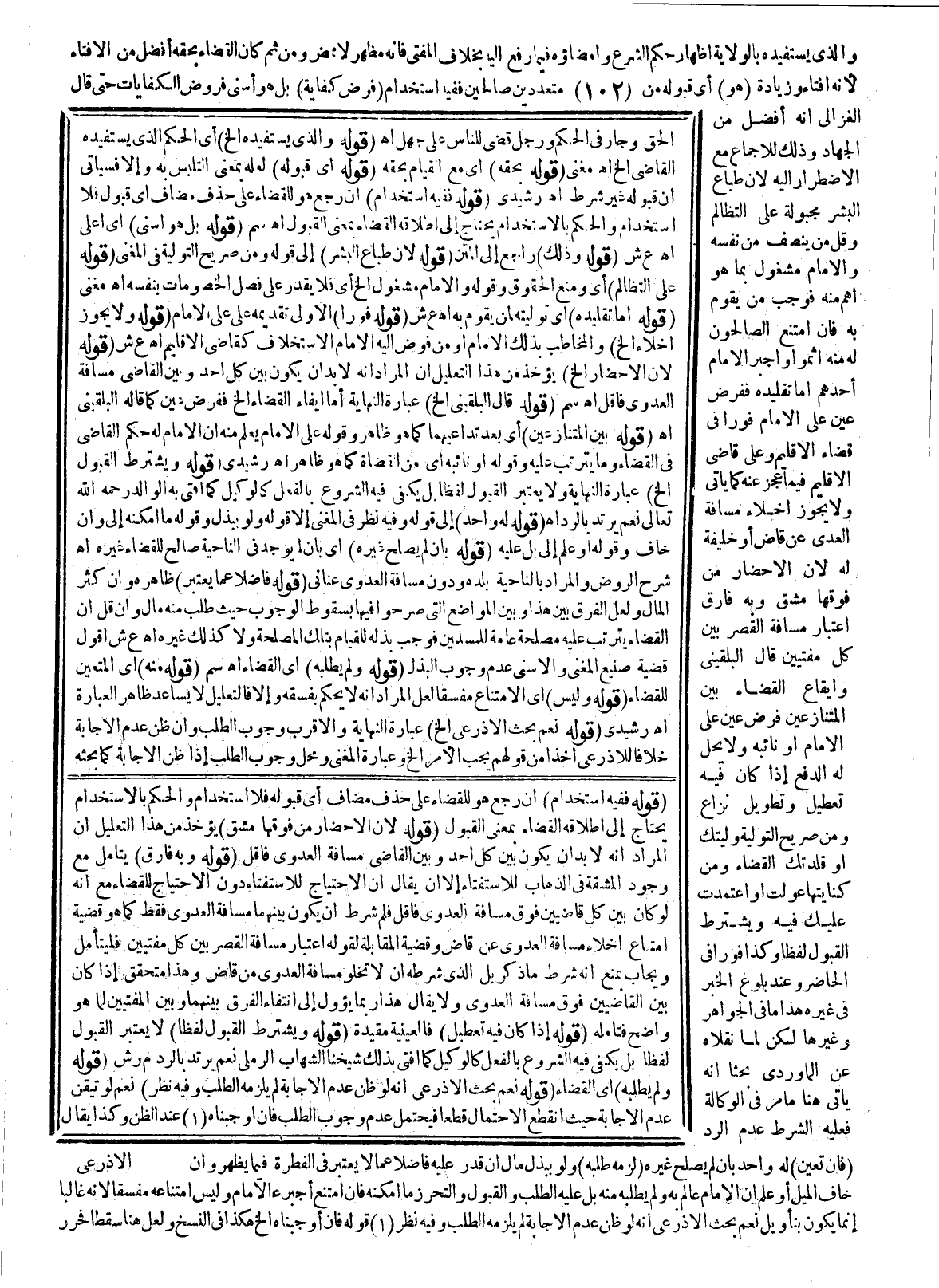 (هُوَ) أَيْ: قَبُولُهُ مِنْ مُتَعَدِّدِينَ صَالِحِينَ فَفِيهِ اسْتِخْدَامٌ (فَرْضُ كِفَايَةٍ) بَلْ هُوَ أَسْنَى فُرُوضِ الْكِفَايَاتِ حَتَّى قَالَ الْغَزَالِيُّ: إنَّهُ أَفْضَلُ مِنْ الْجِهَادِ وَذَلِكَ لِلْإِجْمَاعِ مَعَ الِاضْطِرَارِ إلَيْهِ؛ لِأَنَّ طِبَاعَ الْبَشَرِ مَجْبُولَةٌ عَلَى التَّظَالُمِ وَقَلَّ مَنْ يُنْصِفُ مِنْ نَفْسِهِ، وَالْإِمَامُ مَشْغُولٌ بِمَا هُوَ أَهَمُّ مِنْهُ فَوَجَبَ مَنْ يَقُومُ بِهِ فَإِنْ امْتَنَعَ الصَّالِحُونَ لَهُ مِنْهُ أَثِمُوا وَأَجْبَرَ الْإِمَامُ أَحَدَهُمْ، أَمَّا تَقْلِيدُهُ فَفَرْضُ عَيْنٍ عَلَى الْإِمَامِ فَوْرًا فِي قَضَاءِ الْإِقْلِيمِ وَعَلَى قَاضِي الْإِقْلِيمِ فِيمَا عَجَزَ عَنْهُ كَمَا يَأْتِي، وَلَا يَجُوزُ إخْلَاءُ مَسَافَةِ الْعَدْوَى عَنْ قَاضٍ، أَوْ خَلِيفَةٍ لَهُ؛ لِأَنَّ الْإِحْضَارَ مِنْ فَوْقِهَا مُشِقٌّ وَبِهِ فَارَقَ اعْتِبَارَ مَسَافَةِ الْقَصْرِ بَيْنَ كُلِّ مُفْتِيَيْنِ قَالَ الْبُلْقِينِيُّ: وَإِيقَاعُ الْقَضَاءِ بَيْنَ الْمُتَنَازِعَيْنِ فَرْضُ عَيْنٍ عَلَى الْإِمَامِ، أَوْ نَائِبِهِ، وَلَا يَحِلُّ لَهُ الدَّفْعُ إذَا كَانَ فِيهِ تَعْطِيلُ وَتَطْوِيلُ نِزَاعٍ. وَمِنْ صَرِيحِ التَّوْلِيَةِ وَلَّيْتُك أَوْ قَلَّدْتُك الْقَضَاءَ، وَمِنْ كِنَايَتِهَا عَوَّلْت، أَوْ اعْتَمَدْت عَلَيْك فِيهِ، وَيُشْتَرَطُ الْقَبُولُ لَفْظًا، وَكَذَا فَوْرًا فِي الْحَاضِرِ وَعِنْدَ بُلُوغِ الْخَبَرِ فِي غَيْرِهِ هَذَا مَا فِي الْجَوَاهِرِ وَغَيْرِهَا، لَكِنْ لَمَّا نَقَلَاهُ عَنْ الْمَاوَرْدِيِّ بَحَثَا أَنَّهُ يَأْتِي هُنَا مَا مَرَّ فِي الْوَكَالَةِ فَعَلَيْهِ الشَّرْطُ عَدَمُ الرَّدِّ