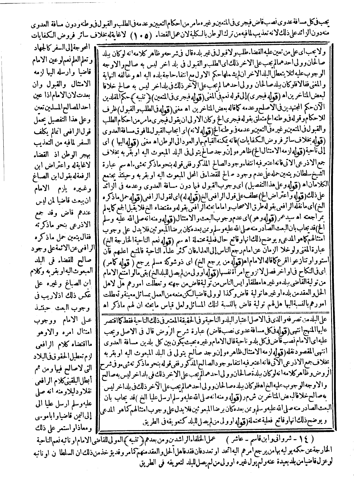 يَجِبُ فِي كُلِّ مَسَافَةِ عَدْوَى نَصْبُ قَاضٍ فَيَجْرِي فِي الْمُتَعَيَّنِ وَغَيْرِهِ مَا مَرَّ مِنْ أَحْكَامِ التَّعْيِينِ وَعَدَمِهِ فِي الطَّلَبِ، وَالْقَبُولِ فِي وَطَنِهِ وَدُونَ مَسَافَةِ الْعَدْوَى مِنْهُ دُونَ الزَّائِدِ عَلَى ذَلِكَ؛ لِأَنَّهُ تَعْذِيبٌ لِمَا فِيهِ مِنْ تَرْكِ الْوَطَنِ بِالْكُلِّيَّةِ؛ لِأَنَّ عَمَلَ الْقَضَاءِ لَا غَايَةَ لَهُ، بِخِلَافِ سَائِرِ فُرُوضِ الْكِفَايَاتِ الْمُحْوِجَةِ إلَى السَّفَرِ كَالْجِهَادِ وَتَعَلُّمِ الْعِلْمِ، نَعَمْ لَوْ عَيَّنَ الْإِمَامُ قَاضِيًا وَأَرْسَلَهُ إلَيْهَا لَزِمَهُ الِامْتِثَالُ، وَالْقَبُولُ، وَإِنْ بَعُدَتْ؛ لِأَنَّ الْإِمَامَ إذَا عَيَّنَ أَحَدًا لِمَصَالِحِ الْمُسْلِمِينَ تَعَيَّنَ. وَعَلَى هَذَا التَّفْصِيلِ يُحْمَلُ قَوْلُ الرَّافِعِيِّ: إنَّمَا لَمْ يُكَلَّفْ السَّفَرَ لِمَا فِيهِ مِنْ التَّعْذِيبِ بِهَجْرِ الْوَطَنِ؛ إذْ الْقَضَاءُ لَا غَايَةَ لَهُ وَاعْتِرَاضُ ابْنِ الرِّفْعَةِ لَهُ بِقَوْلِ ابْنِ الصَّبَّاغِ وَغَيْرِهِ يَلْزَمُ الْإِمَامَ أَنْ يَبْعَثَ قَاضِيًا لِمَنْ لَيْسَ عِنْدَهُمْ قَاضٍ.