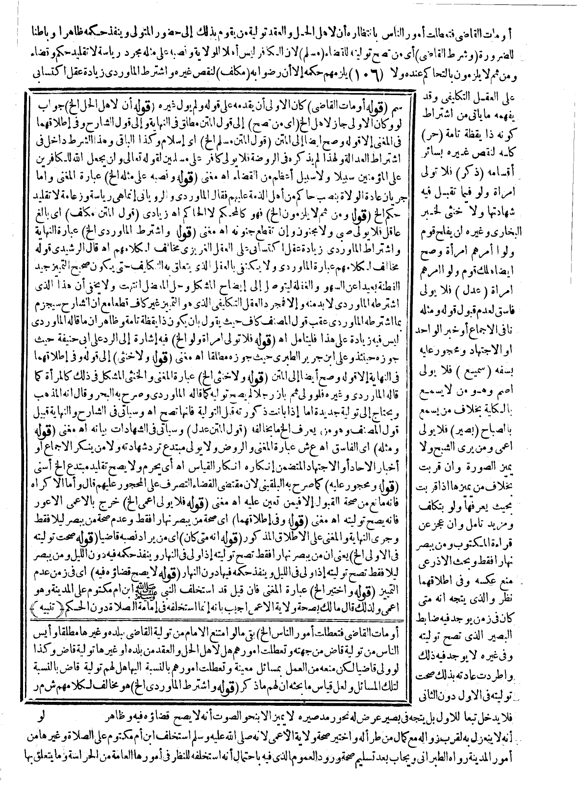 (قَوْلُهُ: لَوْ اشْتَرَطَ الْمَاوَرْدِيُّ إلَخْ) عِبَارَةُ النِّهَايَةِ وَاشْتِرَاطُ الْمَاوَرْدِيِّ زِيَادَةَ عَقْلٍ اكْتِسَابِيٍّ عَلَى الْعَقْلِ الْغَرِيزِيِّ مُخَالِفٌ لِكَلَامِهِمْ. اهـ. قَالَ الرَّشِيدِيُّ: قَوْلُهُ: مُخَالِفٌ لِكَلَامِهِمْ عِبَارَةُ الْمَاوَرْدِيِّ: وَلَا يُكْتَفَى بِالْعَقْلِ الَّذِي يَتَعَلَّقُ بِهِ التَّكْلِيفُ حَتَّى يَكُونَ صَحِيحَ التَّمْيِيزِ جَيِّدَ الْفَطِنَةِ بَعِيدًا عَنْ السَّهْوِ، وَالْغَفْلَةِ لِيَتَوَصَّلَ إلَى إيضَاحِ الْمُشْكِلِ وَحَلِّ الْمُعْضِلِ انْتَهَتْ وَلَا يَخْفَى أَنَّ هَذَا الَّذِي اشْتَرَطَهُ الْمَاوَرْدِيُّ لَا بُدَّ مِنْهُ، وَإِلَّا فَمُجَرَّدُ الْعَقْلِ التَّكْلِيفِيِّ الَّذِي هُوَ التَّمْيِيزُ غَيْرُ كَافٍ قَطْعًا مَعَ أَنَّ الشَّارِحَ سَيَجْزِمُ بِمَا اشْتَرَطَهُ الْمَاوَرْدِيُّ عَقِبَ قَوْلِ الْمُصَنِّفِ: كَافٍ حَيْثُ يَقُولُ بِأَنْ يَكُونَ ذَا يَقَظَةٍ تَامَّةٍ وَظَاهِرٌ أَنَّ مَا قَالَهُ الْمَاوَرْدِيُّ لَيْسَ فِيهِ زِيَادَةٌ عَلَى هَذَا فَلْيُتَأَمَّلْ. اهـ. (قَوْلُهُ: فَلَا تُوَلَّى امْرَأَةٌ وَلَوْ إلَخْ) فِيهِ إشَارَةٌ إلَى الرَّدِّ عَلَى أَبِي حَنِيفَةَ حَيْثُ جَوَّزَهُ حِينَئِذٍ وَعَلَى ابْنِ جَرِيرٍ الطَّبَرِيِّ حَيْثُ جَوَّزَهُ مُطْلَقًا. اهـ. مُغْنِي.