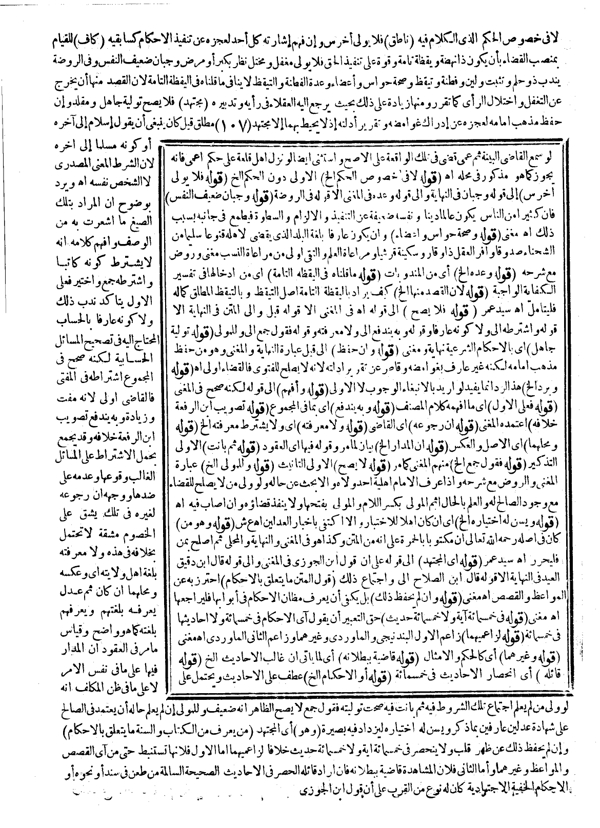 لَا فِي خُصُوصِ الْحُكْمِ الَّذِي الْكَلَامُ فِيهِ (نَاطِقٌ) فَلَا يُوَلَّى أَخْرَسُ، وَإِنْ فَهِمَ إشَارَتَهُ كُلُّ أَحَدٍ لِعَجْزِهِ عَنْ تَنْفِيذِ الْأَحْكَامِ كَسَابِقَيْهِ (كَافٍ) لِلْقِيَامِ بِمَنْصِبِ الْقَضَاءِ بِأَنْ يَكُونَ ذَا نَهْضَةٍ وَيَقَظَةٍ تَامَّةٍ وَقُوَّةٍ عَلَى تَنْفِيذِ الْحَقِّ فَلَا يُوَلَّى مُغَفَّلٌ وَمُخْتَلُّ نَظَرٍ بِكِبَرٍ، أَوْ مَرَضٍ وَجَبَانٌ ضَعِيفُ النَّفْسِ وَفِي الرَّوْضَةِ يُنْدَبُ ذُو حِلْمٍ وَتَثَبُّتٍ وَلِينٍ وَفِطْنَةٍ وَتَيَقُّظٍ وَصِحَّةِ حَوَاسٍّ وَأَعْضَاءٍ.