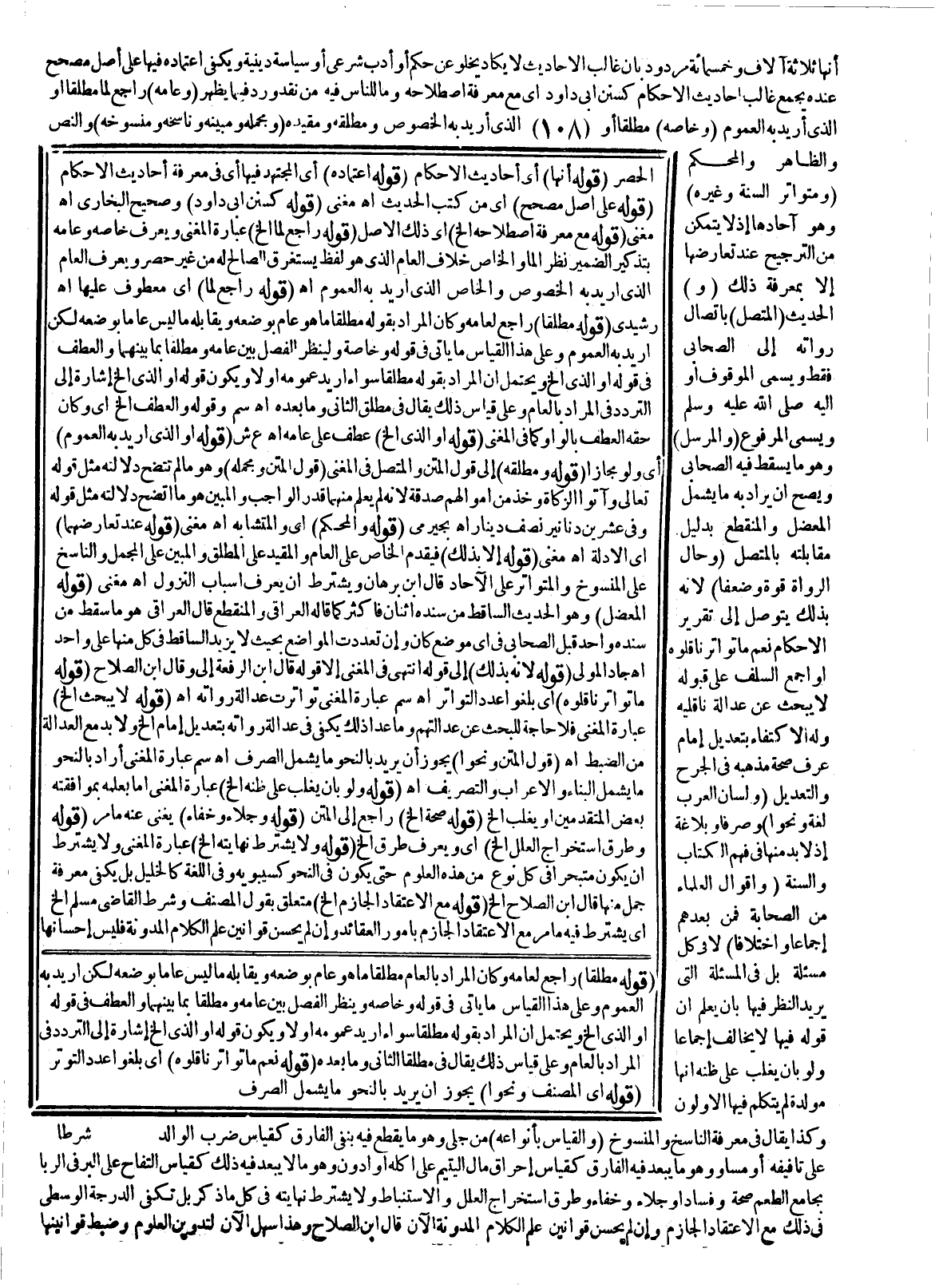 أَنَّهَا ثَلَاثَةُ آلَافٍ وَخَمْسُمِائَةٍ مَرْدُودٌ بِأَنَّ غَالِبَ الْأَحَادِيثِ لَا يَكَادُ يَخْلُو عَنْ حُكْمٍ، أَوْ أَدَبٍ شَرْعِيٍّ، أَوْ سِيَاسَةٍ دِينِيَّةٍ وَيَكْفِي اعْتِمَادُهُ فِيهَا عَلَى أَصْلٍ مُصَحَّحٍ عِنْدَهُ يَجْمَعُ غَالِبَ أَحَادِيثِ الْأَحْكَامِ كَسُنَنِ أَبِي دَاوُد أَيْ: مَعَ مَعْرِفَةِ اصْطِلَاحِهِ وَمَا لِلنَّاسِ فِيهِ مِنْ نَقْدٍ، وَرَدٍّ فِيمَا يَظْهَرُ (وَعَامَّهُ) رَاجِعٌ لِمَا مُطْلَقًا، أَوْ الَّذِي أُرِيدَ بِهِ الْعُمُومُ (وَخَاصَّهُ) مُطْلَقًا، أَوْ الَّذِي أُرِيدَ بِهِ الْخُصُوصُ وَمُطْلَقَهُ وَمُقَيَّدَهُ (وَمُجْمَلَهُ وَمُبَيِّنَةَ وَنَاسِخَهُ وَمَنْسُوخَهُ) ، وَالنَّصَّ، وَالظَّاهِرَ، وَالْمُحْكَمَ (وَمُتَوَاتِرَ السُّنَّةِ وَغَيْرَهُ) ، وَهُوَ آحَادُهَا؛ إذْ لَا يَتَمَكَّنُ مِنْ التَّرْجِيحِ عِنْدَ تَعَارُضِهَا إلَّا بِمَعْرِفَةِ ذَلِكَ (وَ) الْحَدِيثَ (الْمُتَّصِلَ) بِاتِّصَالِ رُوَاتِهِ إلَى الصَّحَابِيِّ فَقَطْ، وَيُسَمَّى الْمَوْقُوفَ، أَوْ إلَيْهِ - صَلَّى اللَّهُ عَلَيْهِ وَسَلَّمَ -، وَيُسَمَّى الْمَرْفُوعَ (وَالْمُرْسَلَ) ، وَهُوَ مَا يَسْقُطُ فِيهِ الصَّحَابِيُّ وَيَصِحُّ أَنْ يُرَادَ بِهِ مَا يَشْمَلُ الْمُعْضَلَ أَوْ الْمُنْقَطِعَ بِدَلِيلِ مُقَابَلَتِهِ بِالْمُتَّصِلِ (وَحَالَ الرُّوَاةِ قُوَّةً وَضَعْفًا) ؛ لِأَنَّهُ بِذَلِكَ يَتَوَصَّلُ إلَى تَقْرِيرِ الْأَحْكَامِ، نَعَمْ مَا تَوَاتَرَ نَاقِلُوهُ، أَوْ أَجْمَعَ السَّلَفُ عَلَى قَبُولِهِ لَا يَبْحَثُ عَنْ عَدَالَةِ نَاقِلِيهِ وَلَهُ الِاكْتِفَاءُ بِتَعْدِيلِ إمَامٍ عَرَفَ صِحَّةَ مَذْهَبِهِ فِي الْجَرْحِ، وَالتَّعْدِيلِ.