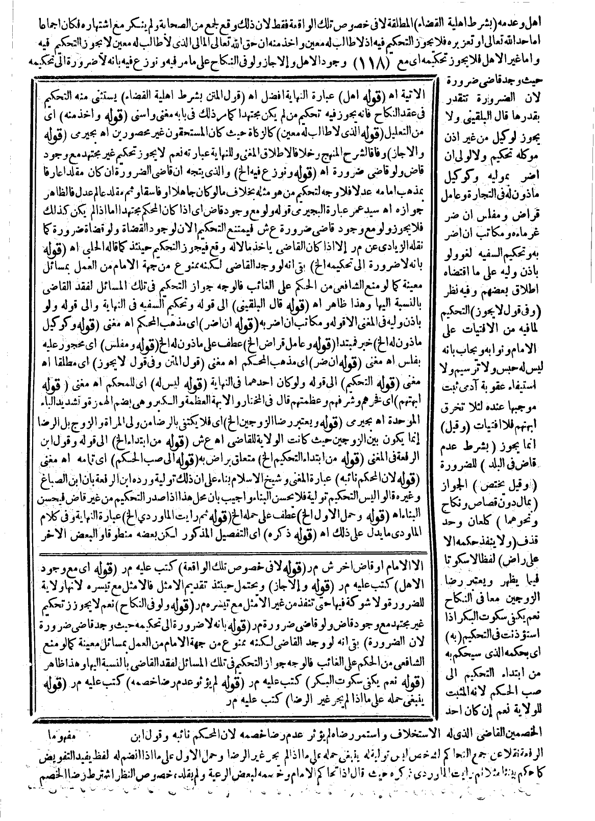 أَهْلٍ وَعَدَمِهِ (بِشَرْطِ أَهْلِيَّةِ الْقَضَاءِ) الْمُطْلَقَةِ لَا فِي خُصُوصِ تِلْكَ الْوَاقِعَةِ فَقَطْ؛ لِأَنَّ ذَلِكَ وَقَعَ لِجَمْعٍ مِنْ الصَّحَابَةِ وَلَمْ يُنْكَرْ مَعَ اشْتِهَارِهِ فَكَانَ إجْمَاعًا. أَمَّا حَدُّ اللَّهِ تَعَالَى، أَوْ تَعْزِيرُهُ فَلَا يَجُوزُ التَّحْكِيمُ فِيهِ؛ إذْ لَا طَالِبَ لَهُ مُعَيَّنٌ، وَأُخِذَ مِنْهُ أَنَّ حَقَّ اللَّهِ تَعَالَى الْمَالِيَّ الَّذِي لَا طَالِبَ لَهُ مُعَيَّنٌ لَا يَجُوزُ التَّحْكِيمُ فِيهِ، وَأَمَّا غَيْرُ الْأَهْلِ فَلَا يَجُوزُ تَحْكِيمُهُ أَيْ: مَعَ وُجُودِ الْأَهْلِ، وَإِلَّا جَازَ وَلَوْ فِي النِّكَاحِ عَلَى مَا مَرَّ فِيهِ. وَنُوزِعَ فِيهِ بِأَنَّهُ لَا ضَرُورَةَ إلَى تَحْكِيمِهِ حَيْثُ وُجِدَ قَاضِي ضَرُورَةٍ؛ لِأَنَّ الضَّرُورَةَ تَتَقَدَّرُ بِقَدْرِهَا قَالَ الْبُلْقِينِيُّ: وَلَا يَجُوزُ لِوَكِيلٍ مِنْ غَيْرِ إذْنِ مُوَكِّلِهِ تَحْكِيمٌ، وَلَا لِوَلِيٍّ إنْ أَضَرَّ بِمُوَلِّيهِ وَكَوَكِيلٍ مَأْذُونٍ لَهُ فِي التِّجَارَةِ وَعَامِلِ قِرَاضٍ وَمُفْلِسٍ إنْ ضَرَّ غُرَمَاءَهُ وَمُكَاتَبٍ إنْ أَضَرَّ بِهِ. وَتَحْكِيمُ السَّفِيهِ لَغْوٌ وَلَوْ بِإِذْنِ وَلِيِّهِ عَلَى مَا اقْتَضَاهُ إطْلَاقُ بَعْضِهِمْ وَفِيهِ نَظَرٌ.