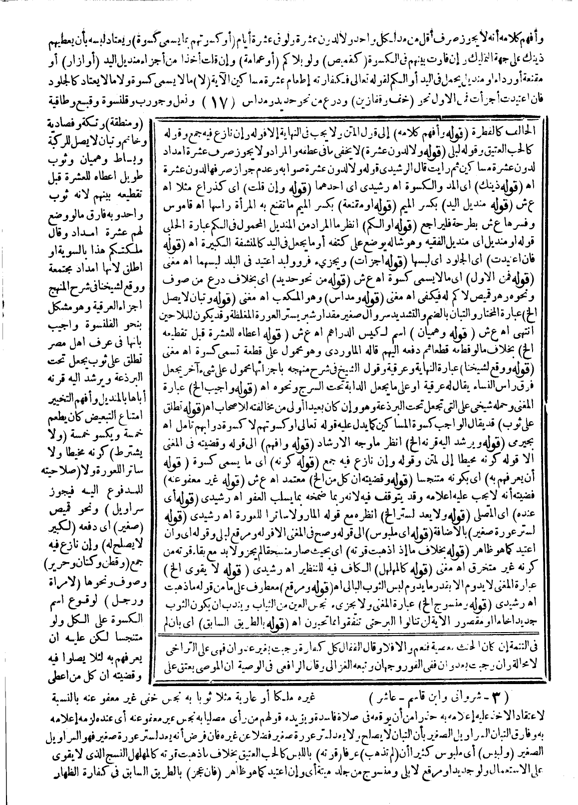 وَأَفْهَمَ كَلَامُهُ أَنَّهُ لَا يَجُوزُ صَرْفُ أَقَلَّ مِنْ مُدٍّ لِكُلِّ وَاحِدٍ وَلَا لِدُونِ عَشَرَةٍ وَلَوْ فِي عَشَرَةِ أَيَّامٍ (أَوْ كُسْوَتِهِمْ بِمَا يُسَمَّى كُسْوَةً) ، وَيُعْتَادُ لُبْسُهُ بِأَنْ يُعْطِيَهُمْ ذَيْنَك عَلَى جِهَةِ التَّمْلِيكِ، وَإِنْ فَاوَتَ بَيْنَهُمْ فِي الْكُسْوَةِ (كَقَمِيصٍ) وَلَوْ بِلَا كُمٍّ (أَوْ عِمَامَةٍ) ، وَإِنْ قُلْت أَخْذًا مِنْ إجْزَاءِ مِنْدِيلِ الْيَدِ (أَوْ إزَارٍ) أَوْ مِقْنَعَةٍ أَوْ رِدَاءٍ أَوْ مِنْدِيلٍ يُحْمَلُ فِي الْيَدِ أَوْ الْكُمِّ لِقَوْلِهِ تَعَالَى {فَكَفَّارَتُهُ إِطْعَامُ عَشَرَةِ مَسَاكِينَ} [المائدة: 89] الْآيَةَ. (لَا) مَا لَا يُسَمَّى كُسْوَةً وَلَا مَا لَا يُعْتَادُ كَالْجُلُودِ فَإِنْ اُعْتِيدَتْ أَجْزَأَتْ فَمِنْ الْأَوَّلِ نَحْوُ (خُفٍّ وَقُفَّازَيْنِ) وَدِرْعٍ مِنْ نَحْوِ حَدِيدٍ وَمَدَاسٍ وَنَعْلٍ وَجَوْرَبٍ وَقَلَنْسُوَةٍ وَقُبَعٍ وَطَاقِيَّةٍ (وَمِنْطَقَةٍ) وَتِكَّةٍ وَفَصَادِيَّةٍ وَخَاتَمٍ وَتُبَّانٍ لَا يَصِلُ لِلرُّكْبَةِ وَبِسَاطٍ وَهِمْيَانٍ وَثَوْبٍ طَوِيلٍ أَعْطَاهُ لِلْعَشَرَةِ قَبْلَ تَقْطِيعِهِ بَيْنَهُمْ؛ لِأَنَّهُ ثَوْبٌ وَاحِدٌ وَبِهِ فَارَقَ مَا لَوْ وَضَعَ لَهُمْ عَشَرَةَ أَمْدَادٍ وَقَالَ: مَلَّكْتُكُمْ هَذَا بِالسَّوِيَّةِ أَوْ أَطْلَقَ؛ لِأَنَّهَا أَمْدَادٌ مُجْتَمِعَةٌ، وَوَقَعَ لِشَيْخِنَا فِي شَرْحِ الْمَنْهَجِ أَجْزَاءُ الْعِرْقِيَّةِ وَهُوَ مُشْكِلٌ بِنَحْوِ الْقَلَنْسُوَةِ، وَأُجِيبَ بِأَنَّهَا فِي عُرْفِ أَهْلِ مِصْرَ تُطْلَقُ عَلَى ثَوْبٍ يُجْعَلُ تَحْتَ الْبَرْذعَةِ وَيُرْشِدُ إلَيْهِ قَرْنُهُ إيَّاهَا بِالْمِنْدِيلِ، وَأَفْهَمَ التَّخْيِيرُ امْتِنَاعَ التَّبْعِيضِ، كَأَنْ يُطْعِمَ خَمْسَةً وَيَكْسُوَ خَمْسَةً.
