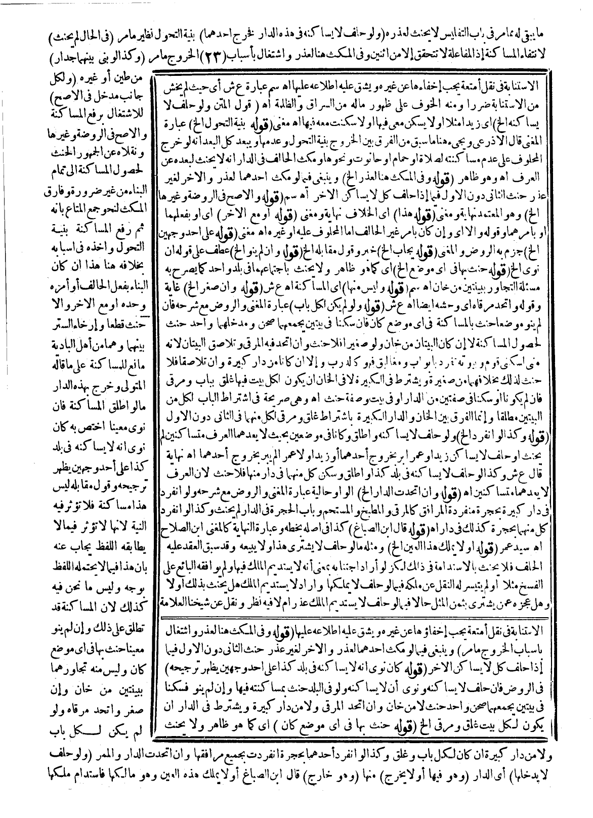 (قَوْلُهُ: يُجَابُ إلَخْ) خَبَرٌ وَقَوْلُ مُقَابِلِهِ إلَخْ (قَوْلُهُ: وَإِنْ لَمْ يَنْوِ إلَخْ) عَطْفٌ عَلَى قَوْلِهِ: إنْ نَوَى إلَخْ. (قَوْلُهُ حَنِثَ بِهَا فِي أَيِّ مَوْضِعٍ إلَخْ) أَيْ: كَمَا هُوَ ظَاهِرٌ وَلَا يَحْنَثُ بِاجْتِمَاعِهِمَا فِي بَلَدٍ وَاحِدٍ كَمَا يُصَرِّحُ بِهِ مَسْأَلَةُ التَّجَاوُرِ بِبَيْتَيْنِ مِنْ خَانٍ اهـ سم. (قَوْلُهُ: وَلَيْسَ مِنْهَا) أَيْ الْمُسَاكَنَةِ اهـ ع ش. (قَوْلُهُ: مَسْأَلَةٌ وَإِنْ صَغُرَ إلَخْ) غَايَةٌ، وَقَوْلُهُ: وَاتَّحَدَ مَرَقَاهُ أَيْ: وَحَشُّهُ أَيْضًا اهـ ع ش. (قَوْلُهُ: وَلَوْ لَمْ يَكُنْ لِكُلِّ بَابٍ) عِبَارَةُ الْمُغْنِي وَالرَّوْضِ مَعَ شَرْحِهِ فَإِنْ لَمْ يَنْوِ مَوْضِعًا حَنِثَ بِالْمُسَاكَنَةِ فِي أَيِّ مَوْضِعٍ كَانَ فَإِنْ سَكَنَا فِي بَيْتَيْنِ يَجْمَعُهُمَا صَحْنٌ وَمَدْخَلُهُمَا وَاحِدٌ حَنِثَ لِحُصُولِ الْمُسَاكَنَةِ لَا إنْ كَانَ الْبَيْتَانِ مِنْ خَانٍ وَلَوْ صَغِيرًا فَلَا حِنْثَ، وَإِنْ اتَّحَدَ فِيهِ الْمَرْقَى وَتَلَاصَقَ الْبَيْتَانِ؛ لِأَنَّهُ مَبْنِيٌّ لِسُكْنَى قَوْمٍ وَبُيُوتُهُ تُفْرَدُ بِأَبْوَابٍ وَمَغَالِيقَ فَهُوَ كَالدَّرْبِ وَإِلَّا إنْ كَانَا مِنْ دَارٍ كَبِيرَةٍ وَإِنْ تَلَاصَقَا فَلَا حِنْثَ لِذَلِكَ بِخِلَافِهِمَا مِنْ صَغِيرَةٍ وَيُشْتَرَطُ فِي الْكَبِيرَةِ لَا فِي الْخَانِ أَنْ يَكُونَ لِكُلِّ بَيْتٍ فِيهَا غَلْقٌ بِبَابٍ وَمَرْقًى فَإِنْ لَمْ يَكُونَا أَوْ سَكَنَا فِي صُفَّتَيْنِ مِنْ الدَّارِ أَوْ فِي بَيْتٍ وَصُفَّةٍ حَنِثَ اهـ. وَهِيَ صَرِيحَةٌ فِي اشْتِرَاطِ الْبَابِ لِكُلٍّ مِنْ الْبَيْتَيْنِ مُطْلَقًا، وَإِنَّمَا الْفَرْقُ بَيْنَ الْخَانِ وَالدَّارِ الْكَبِيرَةِ بِاشْتِرَاطِ غَلْقٍ وَمَرْقًى لِكُلٍّ مِنْهُمَا فِي الثَّانِي دُونَ الْأَوَّلِ.