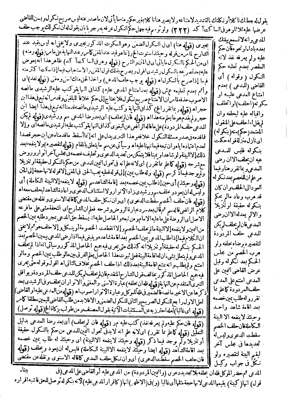 يَقُولَ لَهُ جَعَلْتُكَ نَاكِلًا أَوْ نَكَّلْتُكَ بِالتَّشْدِيدِ؛ لِامْتِنَاعِهِ وَلَا يَصِيرُ هُنَا نَاكِلًا بِغَيْرِ حُكْمٍ، وَمِنْهُ مَا يَأْتِي؛ لِأَنَّ مَا صَدَرَ عَنْهُ لَيْسَ صَرِيحَ نُكُولٍ وَيُسَنُّ لِلْقَاضِي عَرْضُهَا عَلَيْهِ ثَلَاثًا، وَهُوَ فِي السَّاكِتِ آكَدُ، وَلَوْ تَوَسَّمَ فِيهِ جَهْلَ حُكْمِ النُّكُولِ عَرَّفَهُ بِهِ وُجُوبًا بِأَنْ يَقُولَ لَهُ: إنَّ نُكُولَكَ يُوجِبُ حَلِفَ الْمُدَّعِي وَأَنَّهُ لَا تُسْمَعُ بَيِّنَتُكَ بَعْدَهُ بِأَدَاءٍ أَوْ نَحْوِهِ فَإِنْ حَكَمَ عَلَيْهِ وَلَمْ يُعَرِّفْهُ نَفَذَ؛ لِأَنَّهُ الْمُقَصِّرُ بِعَدَمِ تَعَلُّمِهِ حُكْمَ النُّكُولِ (وَقَوْلُهُ) أَيْ: الْقَاضِي (لِلْمُدَّعِي) بَعْدَ امْتِنَاعِ الْمُدَّعَى عَلَيْهِ أَوْ سُكُوتِهِ (احْلِفْ) أَوْ أَتَحْلِفُ وَلَوْ بِإِقْبَالِهِ عَلَيْهِ لِيُحَلِّفَهُ، وَإِنْ لَمْ يَقُلْ لَهُ احْلِفْ عَلَى الْمَنْقُولِ الْمُعْتَمَدِ (حُكْمٌ) مِنْهُ (بِنُكُولِهِ) أَيْ: نَازِلٌ مَنْزِلَةَ قَوْلِهِ حَكَمْتُ بِنُكُولِهِ فَلَيْسَ لِلْمُدَّعَى عَلَيْهِ أَنْ يَحْلِفَ إلَّا إنْ رَضِيَ الْمُدَّعِي، وَبِمَا تَقَرَّرَ هُنَا وَفِيمَا مَرَّ عُلِمَ أَنَّ لِلْخَصْمِ بَعْدَ نُكُولِهِ الْعَوْدُ إلَى الْحَلِفِ، وَإِنْ كَانَ قَدْ هَرَبَ وَعَادَ مَا لَمْ يَحْكُمْ بِنُكُولِهِ حَقِيقَةً أَوْ تَنْزِيلًا، وَإِلَّا لَمْ يَعُدْ لَهُ إلَّا إنْ رَضِيَ الْمُدَّعِي فَإِنْ لَمْ يَحْلِفْ لَمْ يَكُنْ لِلْمُدَّعِي حَلِفُ الْمَرْدُودَةِ لِتَقْصِيرِهِ بِرِضَاهُ بِحَلِفِهِ، وَلَوْ هَرَبَ الْخَصْمُ مِنْ مَجْلِسِ الْحُكْمِ بَعْدَ نُكُولِهِ وَقَبْلَ عَرْضِ الْقَاضِي الْيَمِينَ عَلَى الْمُدَّعِي امْتَنَعَ عَلَى الْمُدَّعِي حَلِفُ الْمَرْدُودَةِ كَمَا عُلِمَ مِمَّا تَقَرَّرَ، وَلَهُ طَلَبُ يَمِينِ خَصْمِهِ بَعْدَ إقَامَةِ شَاهِدٍ وَاحِدٍ، وَحِينَئِذٍ لَا يَنْفَعُهُ إلَّا الْبَيِّنَةُ الْكَامِلَةُ فَإِنْ حَلَفَ الْخَصْمُ سَقَطَتْ الدَّعْوَى، وَلَيْسَ لَهُ تَجْدِيدُهَا فِي مَجْلِسٍ آخَرَ لِيُقِيمَ الْبَيِّنَةَ لِتَقْصِيرِهِ، وَلَوْ نَكَلَ فِي جَوَابِ وَكِيلِ الْمُدَّعِي ثُمَّ حَضَرَ الْمُوَكِّلُ فَلَهُ أَنْ يُحَلِّفَهُ بِلَا تَجْدِيدِ دَعْوَى