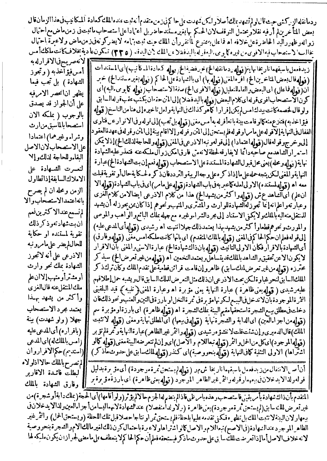 رَدَّ مَا نَقَلَهُ الزَّرْكَشِيُّ حَيْثُ قَالَ: لَوْ لَمْ تَشْهَدْ بِمِلْكٍ أَصْلًا وَلَكِنْ شَهِدَتْ عَلَى حَاكِمٍ فِي زَمَنٍ مُتَقَدِّمٍ أَنَّهُ ثَبَتَ عِنْدَهُ الْمِلْكُ كَعَادَةِ الْمَكَاتِيبِ فِي هَذَا الزَّمَانِ قَالَ بَعْضُ الْمُتَأَخِّرِينَ: لَمْ أَرَ فِيهِ نَقْلًا وَيُحْتَمَلُ التَّوَقُّفُ؛ لِأَنَّ الْحُكْمَ بِهَا بِغَيْرِ مُسْتَنَدٍ حَاضِرٍ، بَلْ اعْتِمَادًا عَلَى اسْتِصْحَابِ مَا ثَبَتَ فِي زَمَنٍ مَاضٍ مَعَ احْتِمَالِ زَوَالِهِ وَظُهُورِ الْيَدِ الْحَاضِرَةِ عَلَى خِلَافِهِ اهـ. فَمَا عَلَّلَ بِهِ مَمْنُوعٌ لِمَا تَقَرَّرَ أَنَّ الْمِلْكَ حَيْثُ ثَبَتَ بِتَمَامِهِ لَا يَضُرُّ كَوْنُهُ فِي زَمَنٍ مَاضٍ وَلَا عِبْرَةَ بِاحْتِمَالٍ يُخَالِفُ الِاسْتِصْحَابَ فِيهِ الْأَقْوَى مِنْ غَيْرِهِ كَمَا يُومِئُ إلَيْهِ قَوْلُهُ: بِالْيَدِ فَضْلًا عَنْ الْمِلْكِ؛ لِأَنَّ الْيَدَ قَدْ تَكُونُ عَادِيَةً بِخِلَافِ كَانَتْ مِلْكَكَ أَمْسِ؛ لِأَنَّهُ صَرِيحٌ فِي الْإِقْرَارِ لَهُ بِهِ أَمْسِ فَيُؤَاخَذُ بِهِ