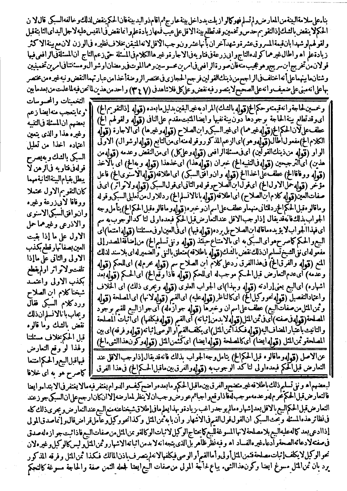 (قَوْلُهُ: وَوِفَاقًا إلَخْ) عَطْفٌ عَلَى أَخْذًا إلَخْ. (قَوْلُهُ: وَإِنْ وَافَقَ السُّبْكِيَّ) أَيْ: إطْلَاقَهُ. (قَوْلُهُ: الْإِسْنَوِيُّ إلَخْ) فَاعِلٌ مُؤَخَّرٌ. (قَوْلُهُ: حَمْلُ الْأَوَّلِ إلَخْ) أَيْ: قَوْلِ ابْنِ الصَّلَاحِ وَقَوْلُهُ وَالثَّانِي أَيْ: قَوْلِ السُّبْكِيّ. (قَوْلُهُ: وَلَا تَوَاتُرَ) أَيْ: فِي صِفَاتِ الْعَيْنِ. (قَوْلُهُ: كَلَامَ ابْنِ الصَّلَاحِ) أَيْ: إطْلَاقَهُ. (قَوْلُهُ: بِأَنَّا لَا نُسَلِّمُ إلَخْ) رَدٌّ لِلْأَوَّلِ مِنْ تَعْلِيلَيْ السُّبْكِيّ وَقَوْلُهُ: وَمَا قَالُوهُ قَبْلَ الْحُكْمِ إلَخْ رَدٌّ لِلثَّانِي مِنْهُمَا وَعَطْفٌ عَلَى اسْمِ أَنَّ وَخَبَرِهِ. (قَوْلُهُ: وَمَا قَالُوهُ قَبْلَ الْحُكْمِ إلَخْ) يُتَأَمَّلُ وَجْهُ الْجَوَابِ بِذَلِكَ فَإِنَّهُ قَدْ يُقَالُ إذَا وَجَبَ الْأَقَلُّ عِنْدَ التَّعَارُضِ قَبْلَ الْحُكْمِ فَبَعْدَهُ أَوْلَى لِتَأَكُّدِ الْوُجُوبِ بِهِ سم أَيْ: فَهَذَا الْجَوَابُ لَا يُؤَيِّدُ مَا قَالَهُ ابْنُ الصَّلَاحِ بَلْ يَرُدُّهُ. (قَوْلُهُ: فِيهَا) أَيْ: فِي الْعَيْنِ أَوْ فِي مَسْأَلَتِنَا. (قَوْلُهُ: امْتَنَعَا) أَيْ: الْبَيْعُ وَالْحُكْمُ كَمَا صَرَّحَ هُوَ أَيْ: السُّبْكِيُّ بِهِ أَيْ: بِالِامْتِنَاعِ حِينَئِذٍ. (قَوْلُهُ: وَنَفْيُ تَسْلِيمِ إلَخْ) مِنْ إضَافَةِ الْمَصْدَرِ إلَى مَفْعُولِهِ أَيْ: نَفْيُ الشَّيْخِ تَسْلِيمَ أَنَّ ذَلِكَ نَقْضٌ بِالشَّكِّ. (قَوْلُهُ: بِإِطْلَاقِهِ) مُتَعَلِّقٌ بِالنَّفْيِ وَالضَّمِيرُ لَهُ أَيْ: بِلَا سَنَدٍ لِذَلِكَ الْمَنْعِ. (قَوْلُهُ: وَالْفَرْقُ إلَخْ) فِي هَذَا الْفَرْقِ رَدٌّ عَلَى كَلَامِ ابْنِ الصَّلَاحِ سم. (قَوْلُهُ: مُحَرِّمٌ لَهُ) أَيْ: لِلْحُكْمِ. (قَوْلُهُ: وَعَدَمُهُ) أَيْ: عَدَمُ التَّعَارُضِ قَبْلَ الْحُكْمِ مُوجِبٌ لَهُ أَيْ: لِلْحُكْمِ. (قَوْلُهُ: فَإِذَا وَقَعَ إلَخْ) أَيْ: الْحُكْمُ. (قَوْلُهُ: بَعْدَ إشْهَارِهِ) أَيْ: الْبَيْعِ يَعْنِي إرَادَتَهُ. (قَوْلُهُ: وَبِهَذَا) أَيْ: الْجَوَابِ الْعُلْوِيِّ. (قَوْلُهُ: وَيَجْرِي ذَلِكَ) أَيْ: الْخِلَافُ وَاعْتِمَادُ التَّفْصِيلِ. (قَوْلُهُ: نَحْوُ وَكِيلٍ إلَخْ) أَيْ: كَالنَّاظِرِ. (قَوْلُهُ: عَلَيْهِ) أَيْ: الْقَيِّمِ. (قَوْلُهُ: لِأَنَّهَا) أَيْ: الْمَصْلَحَةَ. (قَوْلُهُ: وَثَمَنُ الْمِثْلِ مِنْ صِفَاتِ الْبَيْعِ) عَطْفٌ عَلَى اسْمِ أَنَّ وَخَبَرِهَا. (قَوْلُهُ: جَوَازُهُ لَهُ) أَيْ: جَوَازُ الْبَيْعِ لِلْقَيِّمِ بِوُجُودِ الْمَصْلَحَةِ. (قَوْلُهُ: فِي صِفَتِهِ) أَيْ: فِي ثَمَنِ الْمِثْلِ. (قَوْلُهُ: لَا بُدَّ مِنْ إثْبَاتِهِ) أَيْ: الْقَيِّمِ. (قَوْلُهُ: فَيُكَلَّفُهَا) أَيْ: إثْبَاتَ الْمَصْلَحَةِ وَالتَّأْنِيثُ بِاعْتِبَارِ الْمُضَافِ إلَيْهِ. (قَوْلُهُ: فَكَذَا ثَمَنُ الْمِثْلِ) أَيْ: يُكَلَّفُ الْقَيِّمُ أَوْ الْوَصِيُّ إثْبَاتَهُ. (قَوْلُهُ: وَفَرْقُهُ إلَخْ) أَيْ: بَيْنَ الْمَصْلَحَةِ وَثَمَنِ الْمِثْلِ. (قَوْلُهُ: أَيْضًا) أَيْ: كَالْمَصْلَحَةِ. (قَوْلُهُ: أَيْضًا) أَيْ: كَثَمَنِ الْمِثْلِ. (قَوْلُهُ: وَكَوْنَ هَذَا الشَّيْءِ إلَخْ)