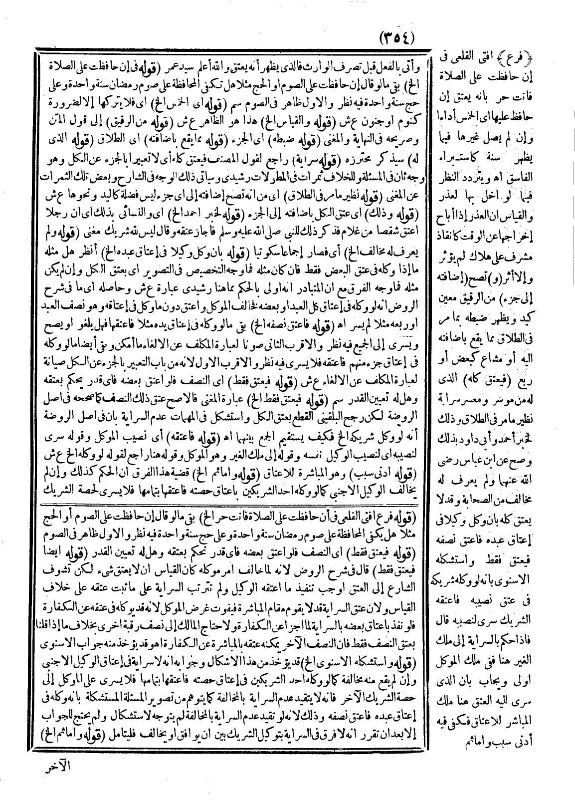 (قَوْلُهُ: وَاسْتَشْكَلَهُ الْإِسْنَوِيُّ إلَخْ) قَدْ يُؤْخَذُ مِنْ هَذَا الْإِشْكَالِ وَجَوَابِهِ أَنَّهُ لَا سِرَايَةَ فِي إعْتَاقِ الْوَكِيلِ الْأَجْنَبِيِّ وَإِنْ لَمْ يَقَعْ مِنْهُ مُخَالَفَةٌ كَمَا لَوْ وَكَّلَهُ أَحَدُ الشَّرِيكَيْنِ فِي إعْتَاقِ حِصَّتِهِ فَأَعْتَقَهَا بِتَمَامِهَا فَلَا يَسْرِي عَلَى الْمُوَكِّلِ إلَى حِصَّةِ الشَّرِيكِ الْآخَرِ، فَإِنَّهُ لَا يَتَقَيَّدُ عَدَمُ السِّرَايَةِ بِالْمُخَالَفَةِ كَمَا يُتَوَهَّمُ مِنْ تَصْوِيرِ الْمَسْأَلَةِ الْمُسْتَشْكِلَةِ بِأَنَّهُ وَكَّلَهُ فِي إعْتَاقِ عَبْدِهِ فَأَعْتَقَ نِصْفَهُ، وَذَلِكَ؛ لِأَنَّهُ لَوْ تَقَيَّدَ عَدَمُ السِّرَايَةِ بِالْمُخَالَفَةِ لَمْ يَتَوَجَّهْ الِاسْتِشْكَالُ، وَلَمْ يَحْتَجْ لِلْجَوَابِ إلَّا بَعْدَ أَنْ تَقَرَّرَ أَنَّهُ لَا فَرْقَ فِي السِّرَايَةِ بِتَوْكِيلِ الشَّرِيكِ بَيْنَ أَنْ يُوَافِقَ أَوْ يُخَالِفَ فَلْيُتَأَمَّلْ. (قَوْلُهُ: وَأَمَّا ثَمَّ إلَخْ)
