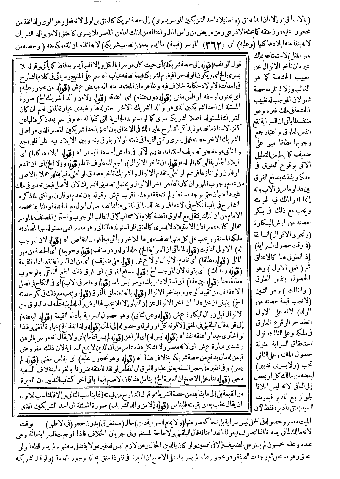 ـــــــــــــــــــــــــــــQقَوْلِ الْوَقْفِ. (قَوْلُهُ: إلَى حِصَّةِ شَرِيكِهِ) أَيْ: حَيْثُ كَانَ مُوسِرًا بِالْكُلِّ وَإِلَّا فَفِيمَا أَيْسَرَ بِهِ فَقَطْ كَمَا يَأْتِي وَقَوْلُهُ: فَلَا يَسْرِي إلَخْ أَيْ: وَيَكُونُ الْوَلَدُ حُرًّا فَيَغْرَمُ لِشَرِيكِهِ قِيمَةَ نِصْفِهِ عُبَابٌ اهـ سم عَلَى الْمَنْهَجِ وَسَيَأْتِي فِي كَلَامِ الشَّارِحِ فِي أُمَّهَاتِ الْأَوْلَادِ حِكَايَةُ خِلَافٍ فِيهِ وَظَاهِرُهُ أَنَّ الْمُعْتَمَدَ مِنْهُ أَنَّهُ مُبَعَّضٌ ع ش. (قَوْلُهُ: مِنْ مَحْجُورٍ عَلَيْهِ) أَيْ: بِجُنُونٍ أَوْ سَفَهٍ أَوْ فَلَسٍ مُغْنِي. (قَوْلُهُ: دُونَ عِتْقِهِ) أَيْ: إعْتَاقِهِ. (قَوْلُهُ: إلَّا مِنْ وَالِدِ الشَّرِيكِ إلَخْ) صُورَةُ الْمَسْأَلَةِ أَنَّ أَحَدَ الشَّرِيكَيْنِ الَّذِي هُوَ وَالِدُ الشَّرِيكِ الْآخَرِ اسْتَوْلَدَهَا رَشِيدِيٌّ عِبَارَةُ الْمُغْنِي نَعَمْ إنْ كَانَ الشَّرِيكُ الْمُسْتَوْلِدُ أَصْلًا لِشَرِيكِهِ سَرَى كَمَا لَوْ اسْتَوْلَدَ الْجَارِيَةَ الَّتِي كُلُّهَا لَهُ اهـ. وَفِي سم بَعْدَ ذِكْرِ مِثْلِهَا عَنْ كَنْزِ الْأُسْتَاذِ مَا نَصُّهُ: وَلَمْ يَذْكُرْ الشَّارِحُ نَظِيرَ ذَلِكَ فِي الْإِعْتَاقِ بِأَنْ أَعْتَقَ أَحَدُ الشَّرِيكَيْنِ الْمُعْسِرُ الَّذِي هُوَ أَصْلُ الشَّرِيكِ الْآخَرِ حِصَّتَهُ فَهَلْ يَسْرِي وَتَبْقَى الْقِيمَةُ فِي ذِمَّتِهِ أَوْ لَا وَيُفَرَّقُ بَيْنَهُ وَبَيْنَ الْإِيلَادِ؟ فِيهِ نَظَرٌ فَلْيُرَاجَعْ وَالثَّانِي هُوَ مُقْتَضَى تَضْعِيفِ اسْتِثْنَاءِ بَعْضِهِمْ الْآتِي فِي هَامِشِ أَحَدِهَا الْيَسَارُ اهـ. (قَوْلُهُ: إيلَادُهَا كُلِّهَا) أَيْ: إيلَادُ الْجَارِيَةِ الَّتِي كُلُّهَا لِوَلَدِهِ. (قَوْلُهُ: إنْ تَأَخَّرَ الْإِنْزَالُ إلَخْ) رَاجِعٌ لِلْمَعْطُوفِ فَقَطْ. (قَوْلُهُ: وَإِلَّا إلَخْ) أَيْ: بِأَنْ تَقَدَّمَ أَوْ قَارَنَ وَلَوْ تَنَازَعَا فَزَعَمَ الْوَاطِئُ تَقَدُّمَ الْإِنْزَالِ وَالشَّرِيكُ تَأَخُّرَ صُدِّقَ الْوَاطِئُ فِيمَا يَظْهَرُ عَمَلًا بِالْأَصْلِ مِنْ عَدَمِ وُجُوبِ الْمَهْرِ وَإِنْ كَانَ الظَّاهِرُ تَأَخُّرَ الْإِنْزَالِ وَيُحْتَمَلُ تَصْدِيقُ الشَّرِيكِ لِأَنَّ الْأَصْلَ فِيمَنْ تَعَدَّى فِي مِلْكِ غَيْرِهِ الضَّمَانُ حَتَّى يُوجَدَ مُسْقِطٌ وَلَمْ نَتَحَقَّقْهُ وَهَذَا أَقْرَبُ ع ش.
