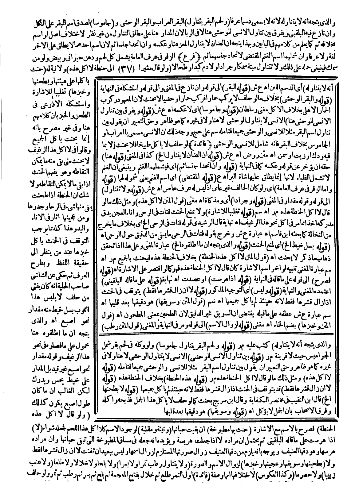 (وَلَحْمُ الْبَقَرِ يَتَنَاوَلُ) الْبَقَرَ الْعِرَابَ وَالْبَقَرَ الْوَحْشِيَّ وَ (جَامُوسًا) لِصِدْقِ اسْمِ الْبَقَرِ عَلَى الْكُلِّ، وَإِنْ نَازَعَ فِيهِ الْبُلْقِينِيُّ، وَيُفَرَّقُ بَيْنَ تَنَاوُلِ الْإِنْسِيِّ لِلْوَحْشِيِّ هُنَا لَا فِي الرِّبَا؛ لِأَنَّ الْمَدَارَ هُنَا عَلَى مُطْلَقِ التَّنَاوُلِ مِنْ غَيْرِ نَظَرٍ لِاخْتِلَافِ أَصْلٍ أَوْ اسْمٍ بِخِلَافِهِ ثَمَّ كَمَا يُعْلَمُ مِنْ كَلَامِهِمْ فِي الْبَابَيْنِ، وَبِهَذَا يُتَّجَهُ أَنَّ الضَّأْنَ لَا يَتَنَاوَلُ الْمَعْزَ هُنَا وَعَكْسُهُ، وَإِنْ اتَّحِدَا جِنْسًا، ثُمَّ لِأَنَّ اسْمَ أَحَدِهِمَا لَا يُطْلَقُ عَلَى الْآخَرِ لُغَةً وَلَا عُرْفًا، وَإِنْ شَمِلَهُمَا اسْمُ الْغَنَمِ الْمُقْتَضِي لِاتِّحَادِ جِنْسِهِمَا ثَمَّ. (فَرْعٌ)