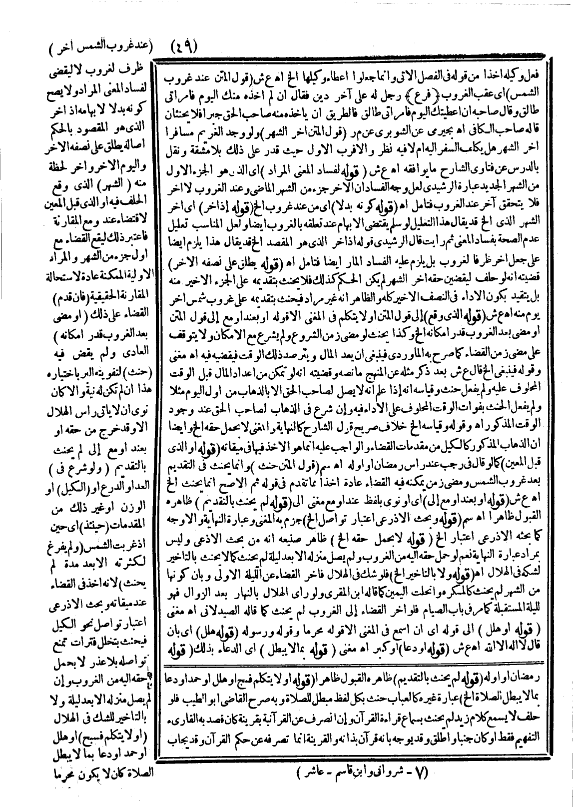 (عِنْدَ غُرُوبِ الشَّمْسِ آخِرَ) ظَرْفٌ لِغُرُوبِ لَا لِيَقْضِيَ؛ لِفَسَادِ الْمَعْنَى الْمُرَادِ وَلَا يَصِحُّ كَوْنُهُ بَدَلًا لِإِبْهَامِهِ إذْ آخِرُ الَّذِي هُوَ الْمَقْصُودُ بِالْحُكْمِ أَصَالَةً يُطْلَقُ عَلَى نِصْفِهِ الْآخَرِ وَالْيَوْمِ الْآخِرِ وَآخِرِ لَحْظَةٍ مِنْهُ (الشَّهْرِ) الَّذِي وَقَعَ الْحَلِفُ فِيهِ أَوْ الَّذِي قَبْلَ الْمُقَارَنَةِ لِاقْتِضَاءِ عِنْدَ وَمَعَ الْمُقَارَنَةَ فَاعْتُبِرَ ذَلِكَ لِيَقَعَ الْقَضَاءُ مَعَ أَوَّلِ جُزْءٍ مِنْ الشَّهْرِ وَالْمُرَادُ الْأَوَّلِيَّةُ الْمُمْكِنَةُ عَادَةً؛ لِاسْتِحَالَةِ الْمُقَارَنَةِ الْحَقِيقِيَّةِ (فَإِنْ قَدَّمَ) الْقَضَاءَ عَلَى ذَلِكَ (أَوْ مَضَى بَعْدَ الْغُرُوبِ قَدْرُ إمْكَانِهِ) الْعَادِيِّ وَلَمْ يَقْضِ فِيهِ (حَنِثَ) لِتَفْوِيتِهِ الْبِرَّ بِاخْتِيَارِهِ هَذَا إنْ لَمْ تَكُنْ لَهُ نِيَّةٌ وَإِلَّا كَأَنْ نَوَى أَنْ لَا يَأْتِيَ رَأْسُ الْهِلَالِ إلَّا وَقَدْ خَرَجَ مِنْ حَقِّهِ أَوْ بِعِنْدَ أَوْ مَعَ إلَى لَمْ يَحْنَثْ بِالتَّقْدِيمِ (وَلَوْ شَرَعَ فِي) الْعَدِّ أَوْ الذَّرْعِ أَوْ (الْكَيْلِ) أَوْ الْوَزْنِ أَوْ غَيْرِ ذَلِكَ مِنْ الْمُقَدِّمَاتِ (حِينَئِذٍ) أَيْ: حِينَ إذْ غَرَبَتْ الشَّمْسُ (وَلَمْ يَفْرُغْ لِكَثْرَتِهِ إلَّا بَعْدَ مُدَّةٍ لَمْ يَحْنَثْ) ؛ لِأَنَّهُ أَخَذَ فِي الْقَضَاءِ عِنْدَ مِيقَاتِهِ وَبَحَثَ الْأَذْرَعِيُّ اعْتِبَارَ تَوَاصُلِ نَحْوِ الْكَيْلِ فَيَحْنَثُ بِتَخَلُّلِ فِئْرَانٍ تَمْنَعُ تَوَاصُلَهُ بِلَا عُذْرٍ لَا بِحَمْلِ حَقِّهِ إلَيْهِ مِنْ الْغُرُوبِ وَإِنْ لَمْ يَصِلْ مَنْزِلَهُ إلَّا بَعْدَ لَيْلَةٍ وَلَا بِالتَّأْخِيرِ لِلشَّكِّ فِي الْهِلَالِ.