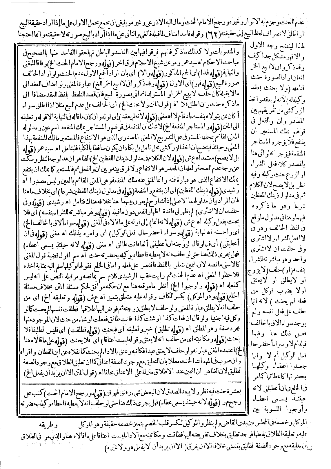 عَدَمِ الْحِنْثِ، وَجَزَمَ بِهِ الْأَنْوَارُ وَغَيْرُهُ وَرَجَّحَ الْإِمَامُ الْحِنْثَ وَمَالَ إلَيْهِ الْأَذْرَعِيُّ وَغَيْرُهُ وَيَنْبَغِي أَنْ يُجْمَعَ بِحَمْلِ الْأَوَّلِ عَلَى مَا إذَا أَرَادَ حَقِيقَةَ الْبَيْعِ أَوْ أَطْلَقَ لِانْصِرَافِ لَفْظِ الْبَيْعِ إلَى حَقِيقَتِهِ وَقَوْلُهُ فَاسِدًا مُنَافٍ لِمَا قَبْلَهُ فَأُلْغِيَ، وَالثَّانِي عَلَى مَا إذَا أَرَادَ بِالْبَيْعِ صُورَتَهُ لَا حَقِيقَتَهُ وَإِنَّمَا احْتَجْنَا لِهَذَا لِيَتَّضِحَ وَجْهُ الْأَوَّلِ وَإِلَّا فَهُوَ مُشْكِلٌ جِدًّا كَيْفَ وَقَدْ ذَكَرُوا فِي لَا أَبِيعُ الْخَمْرَ أَنَّهُ إنْ أَرَادَ الصُّورَةَ حَنِثَ فَتَأَمَّلْهُ. (وَلَا يَحْنَثُ بِعَقْدِ وَكِيلِهِ لَهُ) ؛ لِأَنَّهُ لَمْ يَعْقِدْ وَأَخَذَ الزَّرْكَشِيُّ مِنْ تَفْرِيقِهِمْ بَيْنَ الْمَصْدَرِ وَأَنْ وَالْفِعْلِ فِي قَوْلِهِمْ: يَمْلِكُ الْمُسْتَعِيرُ أَنْ يَنْتَفِعَ فَلَا يُؤَجِّرُ، وَالْمُسْتَأْجِرُ الْمَنْفَعَةَ فَيُؤَجِّرُ أَنَّهُ لَوْ أَتَى هُنَا بِالْمَصْدَرِ كَلَا أَفْعَلُ الشِّرَاءَ أَوْ الزَّرْعَ حَنِثَ بِفِعْلِ وَكِيلِهِ وَفِيهِ نَظَرٌ بَلْ لَا يَصِحُّ؛ لِأَنَّ الْكَلَامَ ثَمَّ فِي مَدْلُولِ ذَيْنِك اللَّفْظَيْنِ شَرْعًا وَهُوَ مَا ذَكَرُوهُ فِيهِمَا وَهُنَا فِي مَدْلُولِ مَا وَقَعَ فِي لَفْظِ الْحَالِفِ وَهُوَ فِي لَا أَفْعَلُ الشِّرَاءَ وَلَا أَشْتَرِي وَفِي حَلَفْت أَنْ لَا أَشْتَرِيَ وَاحِدٌ وَهُوَ مُبَاشَرَتُهُ لِلشِّرَاءِ بِنَفْسِهِ.