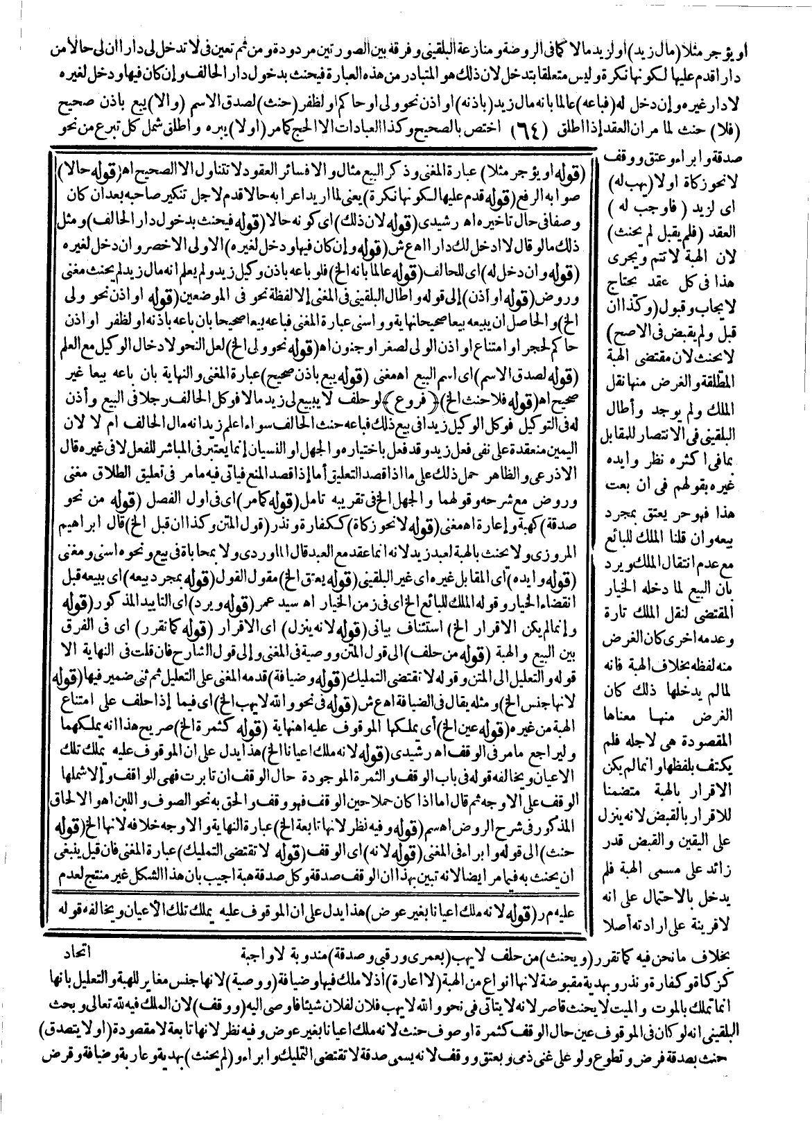 أَوْ يُؤَجِّرُ مَثَلًا (مَالَ زَيْدٍ) أَوْ لِزَيْدٍ مَالًا كَمَا فِي الرَّوْضَةِ وَمُنَازَعَةُ الْبُلْقِينِيِّ وَفَرْقُهُ بَيْنَ الصُّورَتَيْنِ مَرْدُودَةٌ، وَمِنْ ثَمَّ تَعَيَّنَ فِي لَا تَدْخُلْ لِي دَارًا أَنَّ لِي حَالًا مِنْ دَارًا قُدِّمَ عَلَيْهَا لِكَوْنِهَا نَكِرَةً وَلَيْسَ مُتَعَلِّقًا بِتَدْخُلْ؛ لِأَنَّ ذَلِكَ هُوَ الْمُتَبَادَرُ مِنْ هَذِهِ الْعِبَارَةِ فَيَحْنَثُ بِدُخُولِ دَارِ الْحَالِفِ وَإِنْ كَانَ فِيهَا وَدَخَلَ لِغَيْرِهِ لَا دَارَ غَيْرِهِ وَإِنْ دَخَلَ لَهُ (فَبَاعَهُ) عَالِمًا بِأَنَّهُ مَالُ زَيْدٍ (بِإِذْنِهِ) أَوْ إذْنِ نَحْوِ وَلِيٍّ أَوْ حَاكِمٍ أَوْ لِظَفَرٍ (حَنِثَ) لِصِدْقِ الِاسْمِ (وَإِلَّا) يَبِعْ بِإِذْنٍ صَحِيحٍ (فَلَا) حِنْثَ لِمَا مَرَّ أَنَّ الْعَقْدَ إذَا أُطْلِقَ اخْتَصَّ بِالصَّحِيحِ، وَكَذَا الْعِبَادَاتُ إلَّا الْحَجَّ كَمَا مَرَّ (أَوْ لَا) يَبَرُّهُ وَأَطْلَقَ شَمِلَ كُلَّ تَبَرُّعٍ مِنْ نَحْوِ صَدَقَةٍ وَإِبْرَاءٍ وَعِتْقٍ وَوَقْفٍ لَا نَحْوِ زَكَاةٍ أَوْ لَا (يَهَبُ لَهُ) أَيْ: لِزَيْدٍ (فَأَوْجَبَ لَهُ) الْعَقْدَ (فَلَمْ يَقْبَلْ لَمْ يَحْنَثْ) ؛ لِأَنَّ الْهِبَةَ لَمْ تَتِمَّ وَيَجْرِي هَذَا فِي كُلِّ عَقْدٍ يَحْتَاجُ لِإِيجَابِ وَقَبُولٍ (وَكَذَا إنْ قَبِلَ وَلَمْ يَقْبِضْ فِي الْأَصَحِّ) لَا يَحْنَثُ؛ لِأَنَّ مُقْتَضَى الْهِبَةِ الْمُطْلَقَةِ وَالْغَرَضَ مِنْهَا نَقْلُ الْمِلْكِ وَلَمْ يُوجَدْ وَأَطَالَ الْبُلْقِينِيُّ فِي الِانْتِصَارِ لِلْمُقَابِلِ بِمَا فِي أَكْثَرِهِ نَظَرٌ وَأَيَّدَهُ غَيْرُهُ بِقَوْلِهِمْ فِي إنْ بِعْت هَذَا فَهُوَ حُرٌّ يَعْتِقُ بِمُجَرَّدِ بَيْعِهِ وَإِنْ قُلْنَا الْمِلْكُ لِلْبَائِعِ مَعَ عَدَمِ انْتِقَالِ الْمِلْكِ وَيُرَدُّ بِأَنَّ الْبَيْعَ لَمَّا دَخَلَهُ الْخِيَارُ الْمُقْتَضِي لِنَقْلِ الْمِلْكِ تَارَةً وَعَدَمِهِ أُخْرَى كَانَ الْغَرَضُ مِنْهُ لَفْظَهُ بِخِلَافِ الْهِبَةِ فَإِنَّهُ لَمَّا لَمْ يَدْخُلْهَا ذَلِكَ كَانَ الْغَرَضُ مِنْهَا مَعْنَاهَا الْمَقْصُودَةِ هِيَ لِأَجْلِهِ فَلَمْ يَكْتَفِ بِلَفْظِهَا وَإِنَّمَا لَمْ يَكُنْ الْإِقْرَارُ بِالْهِبَةِ مُتَضَمِّنًا لِلْإِقْرَارِ بِالْقَبْضِ؛ لِأَنَّهُ يَنْزِلُ عَلَى الْيَقِينِ وَالْقَبْضُ قَدْرٌ زَائِدٌ عَلَى مُسَمَّى الْهِبَةِ فَلَمْ يَدْخُلْ بِالِاحْتِمَالِ عَلَى أَنَّهُ لَا قَرِينَةَ عَلَى إرَادَتِهِ أَصْلًا بِخِلَافِ مَا نَحْنُ فِيهِ كَمَا تَقَرَّرَ.