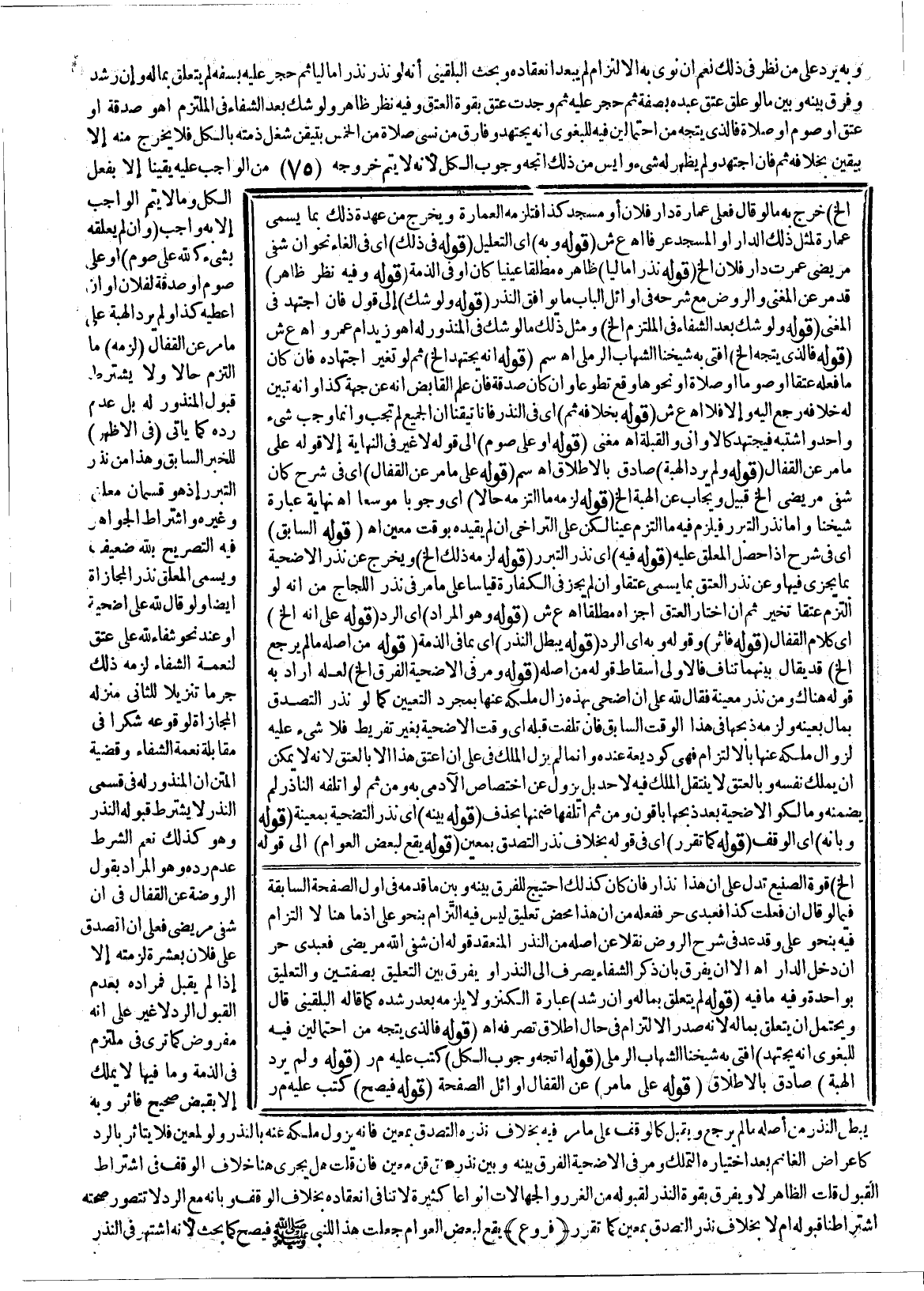 وَبَحَثَ الْبُلْقِينِيُّ أَنَّهُ لَوْ نَذَرَ نَذْرًا مَالِيًّا ثُمَّ حُجِرَ عَلَيْهِ بِسَفَهٍ لَمْ يَتَعَلَّقْ بِمَالِهِ وَإِنْ رَشَدَ وَفَرَّقَ بَيْنَهُ وَبَيْنَ مَا لَوْ عَلَّقَ عِتْقَ عَبْدِهِ بِصِفَةٍ ثُمَّ حُجِرَ عَلَيْهِ ثُمَّ وُجِدَتْ عَتَقَ بِقُوَّةِ الْعِتْقِ وَفِيهِ نَظَرٌ ظَاهِرٌ، وَلَوْ شَكَّ بَعْدَ الشِّفَاءِ فِي الْمُلْتَزَمِ أَهُوَ صَدَقَةٌ أَوْ عِتْقٌ أَوْ صَوْمٌ أَوْ صَلَاةٌ فَاَلَّذِي يُتَّجَهُ مِنْ احْتِمَالَيْنِ فِيهِ لِلْبَغَوِيِّ أَنَّهُ يَجْتَهِدُ وَفَارَقَ مَنْ نَسِيَ صَلَاةً مِنْ الْخَمْسِ بِتَيَقُّنِ شُغْلِ ذِمَّتِهِ بِالْكُلِّ فَلَا يَخْرُجُ مِنْهُ إلَّا بِيَقِينٍ بِخِلَافِ ثَمَّ فَإِنْ اجْتَهَدَ وَلَمْ يَظْهَرْ لَهُ شَيْءٌ وَأَيِسَ مِنْ ذَلِكَ اُتُّجِهَ وُجُوبُ الْكُلِّ؛ لِأَنَّهُ لَا يَتِمُّ خُرُوجُهُ مِنْ الْوَاجِبِ عَلَيْهِ يَقِينًا إلَّا بِفِعْلِ الْكُلِّ وَمَا لَا يَتِمُّ الْوَاجِبُ إلَّا بِهِ وَاجِبٌ (وَإِنْ لَمْ يُعَلِّقْهُ بِشَيْءٍ كَلِلَّهِ عَلَيَّ صَوْمٌ) أَوْ عَلَيَّ صَوْمٌ أَوْ صَدَقَةٌ لِفُلَانٍ أَوْ أَنْ أُعْطِيَهُ كَذَا وَلَمْ يُرِدْ الْهِبَةَ عَلَى مَا مَرَّ عَنْ الْقَفَّالِ (لَزِمَهُ) مَا الْتَزَمَ حَالًّا وَلَا يُشْتَرَطُ قَبُولُ الْمَنْذُورِ لَهُ بَلْ عَدَمُ رَدِّهِ كَمَا يَأْتِي (فِي الْأَظْهَرِ) لِلْخَبَرِ السَّابِقِ وَهَذَا مِنْ نَذْرِ التَّبَرُّرِ إذْ هُوَ قِسْمَانِ مُعَلَّقٌ وَغَيْرُهُ وَاشْتِرَاطُ الْجَوَاهِرِ فِيهِ التَّصْرِيحَ بِلِلَّهِ ضَعِيفٌ وَيُسَمَّى الْمُعَلَّقُ نَذْرَ الْمُجَازَاةِ أَيْضًا.