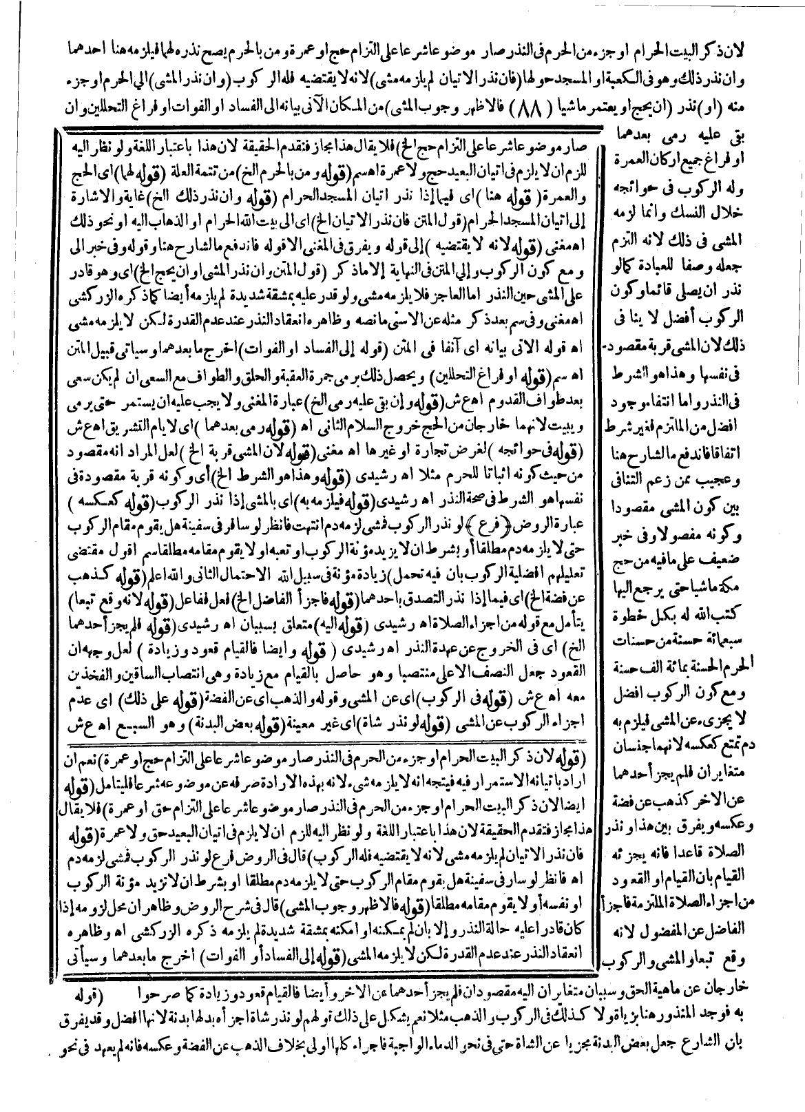 (وَإِنْ نَذَرَ الْمَشْيَ) إلَى الْحَرَمِ أَوْ جُزْءٍ مِنْهُ (أَوْ) نَذَرَ (أَنْ يَحُجَّ أَوْ يَعْتَمِرَ مَاشِيًا فَالْأَظْهَرُ وُجُوبُ الْمَشْيِ) مِنْ الْمَكَانِ الْآتِي بَيَانُهُ إلَى الْفَسَادِ أَوْ الْفَوَاتِ أَوْ فَرَاغِ التَّحَلُّلَيْنِ وَإِنْ بَقِيَ عَلَيْهِ رَمْيٌ بَعْدَهُمَا أَوْ فَرَاغُ جَمِيعِ أَرْكَانِ الْعُمْرَةِ وَلَهُ الرُّكُوبُ فِي حَوَائِجِهِ خِلَالَ النُّسُكِ وَإِنَّمَا لَزِمَهُ الْمَشْيُ فِي ذَلِكَ؛ لِأَنَّهُ الْتَزَمَ جَعْلَهُ وَصْفًا لِلْعِبَادَةِ كَمَا لَوْ نَذَرَ أَنْ يُصَلِّيَ قَائِمًا، وَكَوْنُ الرُّكُوبِ أَفْضَلَ لَا يُنَافِي ذَلِكَ لِأَنَّ الْمَشْيَ قُرْبَةٌ مَقْصُودَةٌ فِي نَفْسِهَا وَهَذَا هُوَ الشَّرْطُ فِي النَّذْرِ، وَأَمَّا انْتِفَاءُ وُجُودِ أَفْضَلَ مِنْ الْمُلْتَزَمِ فَغَيْرُ شَرْطٍ اتِّفَاقًا فَانْدَفَعَ مَا لِلشَّارِحِ هُنَا وَعَجِيبٌ مِمَّنْ زَعَمَ التَّنَافِيَ بَيْنَ كَوْنِ الْمَشْيِ مَقْصُودًا وَكَوْنِهِ مَفْضُولًا