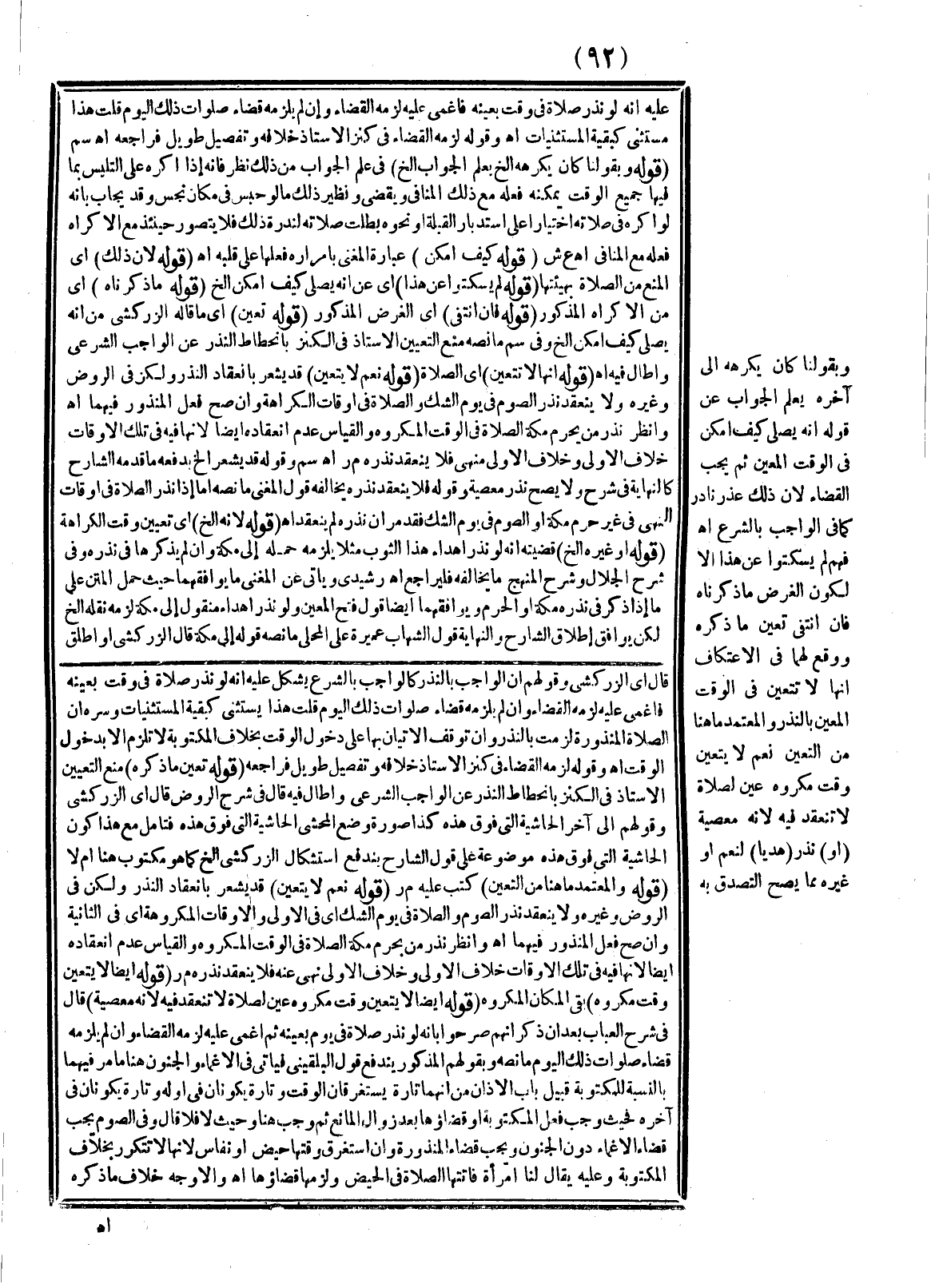 ـــــــــــــــــــــــــــــSقَالَ أَيْ: الزَّرْكَشِيُّ وَقَوْلُهُمْ إنَّ الْوَاجِبَ بِالنَّذْرِ كَالْوَاجِبِ بِالشَّرْعِ يُشْكِلُ عَلَيْهِ أَنَّهُ لَوْ نَذَرَ صَلَاةً فِي وَقْتٍ بِعَيْنِهِ فَأُغْمِيَ عَلَيْهِ لَزِمَهُ الْقَضَاءُ وَإِنْ لَمْ يَلْزَمْهُ قَضَاءُ صَلَوَاتِ ذَلِكَ الْيَوْمِ قُلْت: هَذَا يُسْتَثْنَى كَبَقِيَّةِ الْمُسْتَثْنَيَاتِ وَسِرُّهُ أَنَّ الصَّلَاةَ الْمَنْذُورَةَ لَزِمَتْ بِالنَّذْرِ وَإِنْ تَوَقَّفَ الْإِتْيَانُ بِهَا عَلَى دُخُولِ الْوَقْتِ بِخِلَافِ الْمَكْتُوبَةِ لَا تَلْزَمُ إلَّا بِدُخُولِ الْوَقْتِ انْتَهَى وَقَوْلُهُ: لَزِمَهُ الْقَضَاءُ فِي كَنْزِ الْأُسْتَاذِ خِلَافُهُ وَتَفْصِيلٌ طَوِيلٌ فَرَاجِعْهُ.
