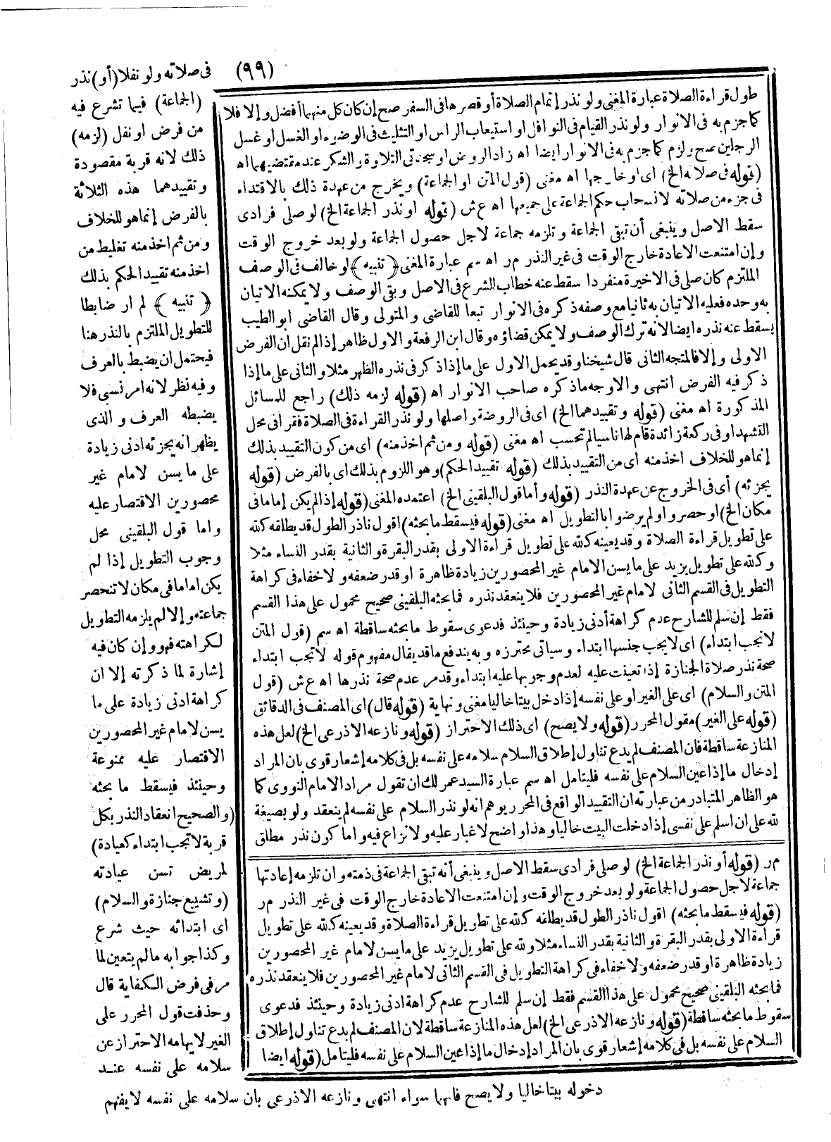 ـــــــــــــــــــــــــــــSقَوْلُهُ: أَوْ نَذَرَ الْجَمَاعَةَ إلَخْ) لَوْ صَلَّى فُرَادَى سَقَطَ الْأَصْلُ وَيَنْبَغِي أَنَّهُ تَبْقَى الْجَمَاعَةُ فِي ذِمَّتِهِ وَأَنْ تَلْزَمَهُ إعَادَتُهَا جَمَاعَةً لِأَجْلِ حُصُولِ الْجَمَاعَةِ وَلَوْ بَعْدَ خُرُوجِ الْوَقْتِ وَإِنْ امْتَنَعَتْ الْإِعَادَةُ خَارِجَ الْوَقْتِ فِي غَيْرِ النَّذْرِ م ر (قَوْلُهُ: فَيَسْقُطُ مَا بَحَثَهُ) أَقُولُ: نَاذِرُ الطُّولِ قَدْ يُطْلِقُهُ كَلِلَّهِ عَلَيَّ تَطْوِيلُ قِرَاءَةِ الصَّلَاةِ، وَقَدْ يُعَيِّنُهُ كَلِلَّهِ عَلَيَّ تَطْوِيلُ قِرَاءَةِ الْأُولَى بِقَدْرِ الْبَقَرَةِ وَالثَّانِيَةِ بِقَدْرِ النِّسَاءِ مَثَلًا وَلِلَّهِ عَلَيَّ تَطْوِيلٌ يَزِيدُ عَلَى مَا يُسَنُّ لِإِمَامِ غَيْرِ الْمَحْصُورِينَ زِيَادَةً ظَاهِرَةً أَوْ قَدْرَ ضِعْفِهِ وَلَا خَفَاءَ فِي كَرَاهَةِ التَّطْوِيلِ فِي الْقِسْمِ الثَّانِي لِإِمَامِ غَيْرِ الْمَحْصُورِينَ فَلَا يَنْعَقِدُ نَذْرُهُ فَمَا بَحَثَهُ الْبُلْقِينِيُّ صَحِيحٌ مَحْمُولٌ عَلَى هَذَا الْقِسْمِ فَقَطْ إنْ سَلَّمَ لِلشَّارِحِ عَدَمَ كَرَاهَةِ أَدْنَى زِيَادَةٍ وَحِينَئِذٍ فَدَعْوَى سُقُوطِ مَا بَحَثَهُ سَاقِطَةٌ