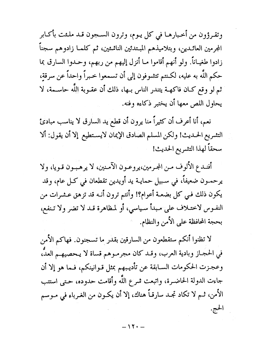 لا تظنوا أنكم ستقطعون من السارقين بقدر ما تسجنون. فهاكم الأمن في الحجاز وبادية العرب، وقد كان مجرموهم قساة لا يحصيهم العد، وعجزت الحكومات السابقة عن تأديبهم بمثل قوانينكم، فما هو إلا أن جاءت الدولة الحاضرة، واتبعت شرع الله وأقامت حدوده، حتى استتب الأمن، ثم لا تكاد تجد سارقاً هناك، إلا أن يكون من الغرباء في موسم الحج.
