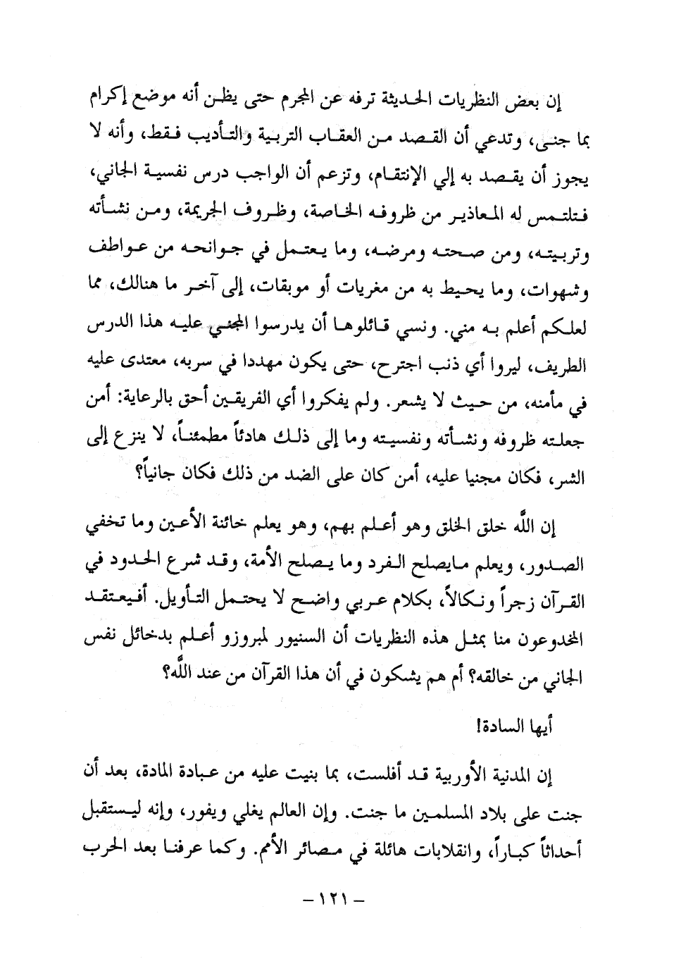 إن بعض النظريات الحديثة ترفه عن المجرم حتى يظن أنه موضع إكرام بما جنى، وتدعي أن القصد من العقاب التربية والتأديب فقط، وأنه لا يجوز أن يقصد به إلى الانتقام، وتزعم أن الواجب درس نفسية الجاني، فتلتمس له المعاذير من ظروفه الخاصة، وظروف الجريمة، ومن نشأته وتربيته، ومن صحته ومرضه، وما يعتمل في جوانحه من عواطف وشهوات، وما يحيط به من مغريات أو موبقات، إلى آخر ما هنالك، مما لعلكم أعلم به مني. ونسي قائلوها أن يدرسوا المجني عليه هذا الدرس الطريف، ليروا أي ذنب اجترح، حتى يكون مهددا في سربه، معتدى عليه في مأمنه، من حيث لا يشعر. ولم يفكروا أي الفريقين أحق بالرعاية: أمن جعلته ظروفه ونشأته ونفسيته وما إلى ذلك هادئاً مطمئناً، لا ينزع إلى الشر، فكان مجنيا عليه، أمن كان على الضد من ذلك فكان جانياً؟