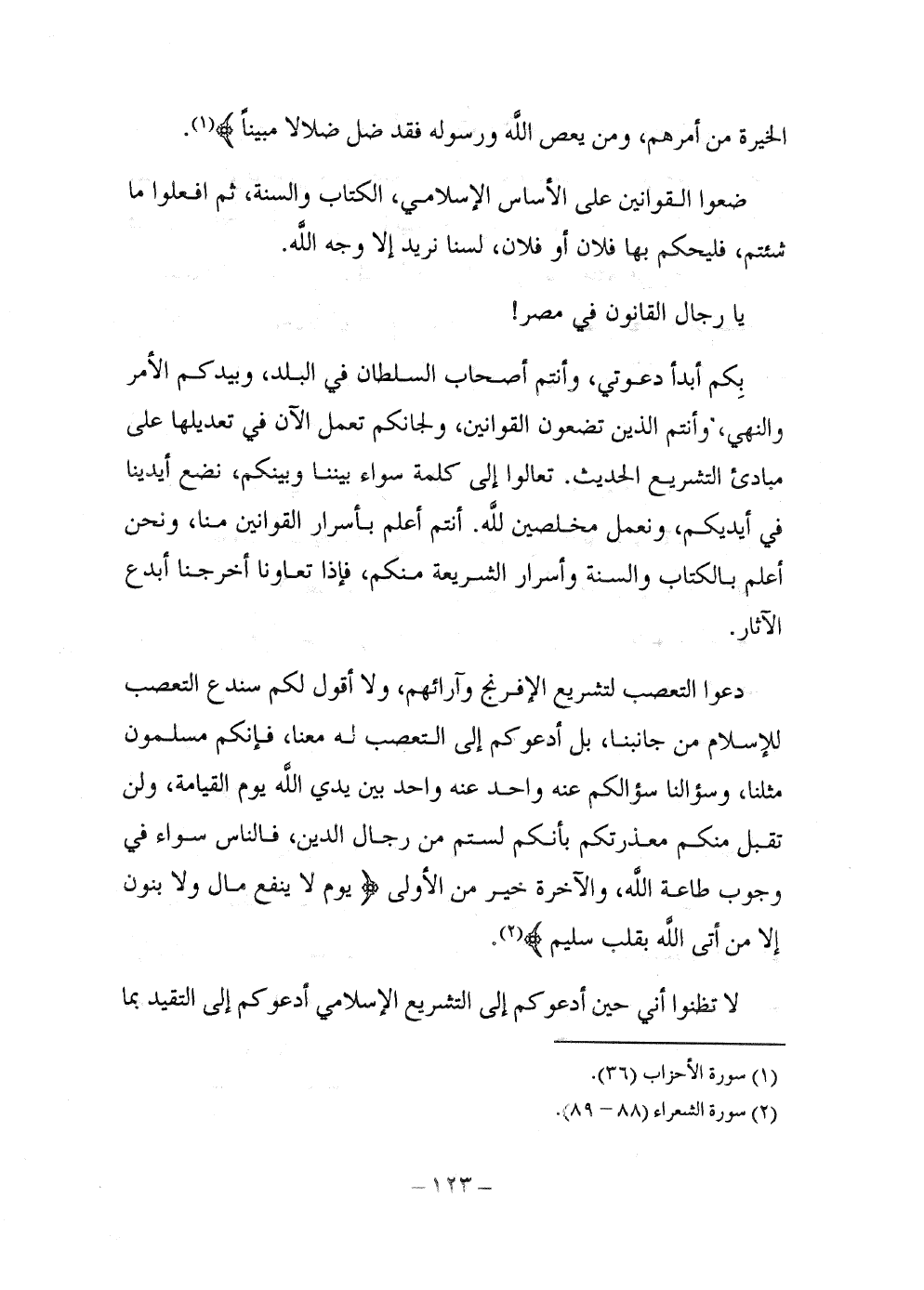 بكم أبدأ دعوتي، وأنتم أصحاب السلطان في البلد، وبيدكم الأمر والنهي، وأنتم الذين تضعون القوانين، ولجانكم تعمل الآن في تعديلها على مبادئ التشريع الحديث. تعالوا إلى كلمة سواء بيننا وبينكم، تضع أيدينا في أيديكم، ونعمل مخلصين لله. أنتم أعلم بأسرار القوانين منا، ونحن أعلم بالكتاب والسنة وأسرار الشريعة منكم، فإذا تعاونا أخرجنا أبدع الآثار.