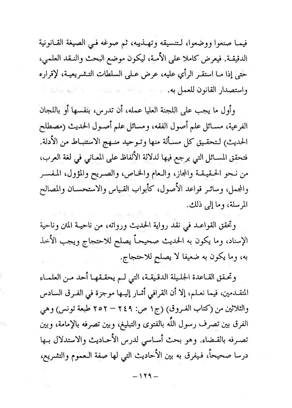 وتحقق القاعدة الجليلة الدقيقة، التي لم يحققها أحد من العلماء المتقدمين، فيما نعلم، إلا أن القرافي أشار إليها موجزة في الفرق السادس والثلاثين من (كتاب الفروق) (ج1 ص:249 - 252 طبعة تونس) وهي الفرق بين تصرف رسول الله بالفتوى والتبليغ، وبين تصرفه بالإمامة، وبين تصرفه بالقضاء. وهو بحث أساسي لدرس الأحاديث والاستدلال بها درساً صحيحاً، فيفرق به بين الأحاديث التي لها صفة العموم والتشريع،