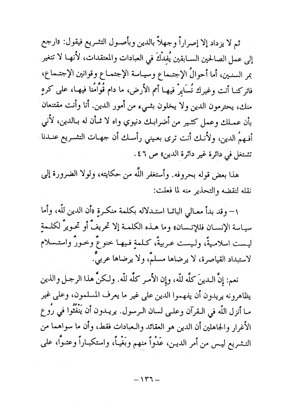 1 - وقد بدأ معالي الباشا استدلاله بكلمة منكرة "أن الدين لله، وأما سياسة الإنسان فللإنسان" وما هذه الكلمة إلا تحريف أو تحوير لكلمة ليست إسلامية، وليست عربية، كلمة فيها خنوع وخور واستسلام لاستبداد القياصرة، لا يرضاها مسلم، ولا يرضاها عربي.