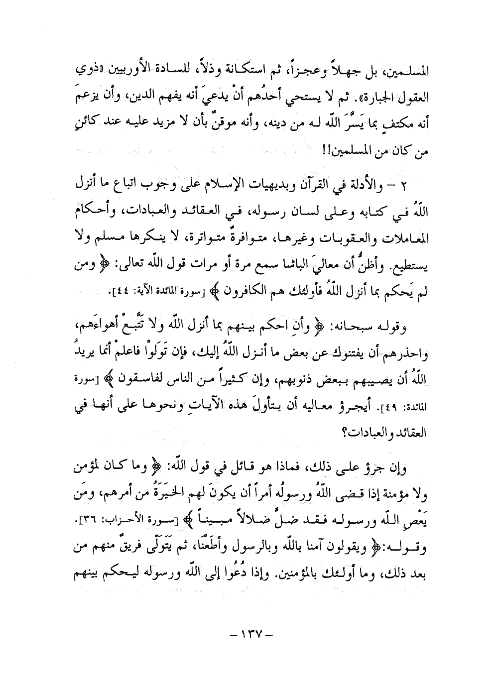 2 - والأدلة في القرآن وبديهيات الإسلام على وجوب اتباع ما أنزل الله في كتابه وعلى لسان رسوله، في العقائد والعبادات، وأحكام المعاملات والعقوبات وغيرها، متوافرة متواترة، لا ينكرها مسلم ولا يستطيع. وأظن أن معالي الباشا سمع مرة أو مرات قول الله تعالى: (وَمَن لَّمْ يَحْكُم بِمَا أَنزَلَ اللهُ فَأُوْلَئِكَ هُمُ الْكَافِرُونَ) [سورة المائدة الآية: 44].