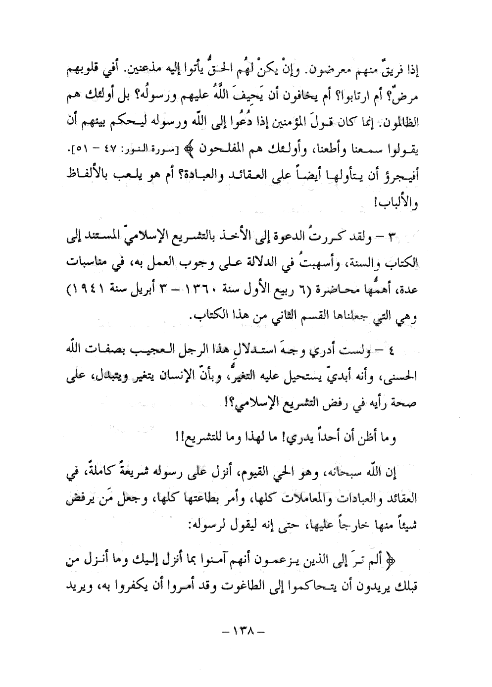 3 - ولقد كررت الدعوة إلى الأخذ بالتشريع الإسلامي المستند إلى الكتاب والسنة، وأسهبتُ في الدلالة على وجوب العمل به، في مناسبات عدة، أهمها محاضرة (6 ربيع الأول سنة 1360هـ - 3 أبريل سنة 1941م) وهي التي جعلناها القسم الثاني من هذا الكتاب.