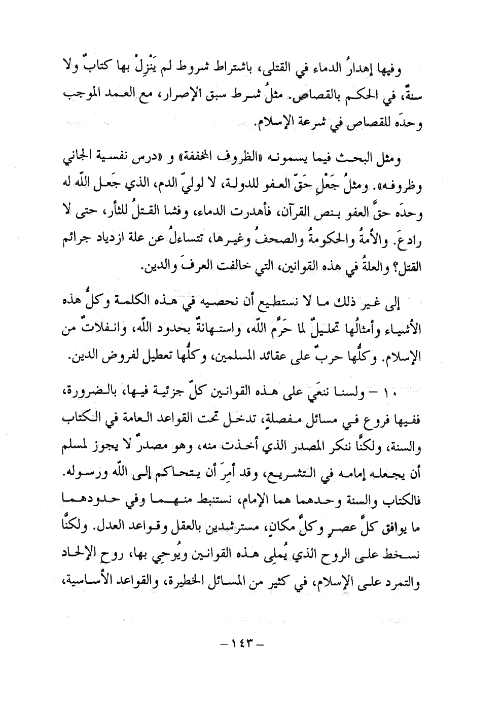 ومثل البحث فيما يسمونه "الظروف المخففة" و"درس نفسية الجاني وظروفه". ومثل جعل حق العفو للدولة، لا لولي الدم، الذي جعل الله له وحده حق العفو بنص القرآن، فأهدرت الدماء، وفشا القتل للثأر، حتى لا رادع. والأمة والحكومة والصحف وغيرها، تتساءل عن علة ازدياد جرائم القتل؟ والعلة في هذه القوانين، التي خالفت العرف والدين.