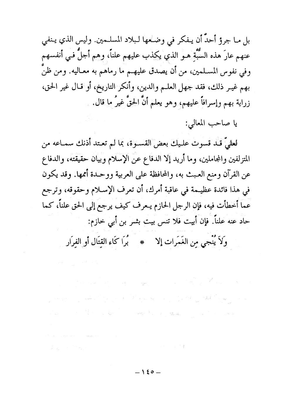 لعلي قد قسوت عليك بعض القسوة، بما لم تعتد أذنك سماعه من المتزلفين والمجاملين، وما أريد إلا الدفاع عن الإسلام وبيان حقيقته، والدفاع عن القرآن ومنع العبث به، والمحافظة على العربية ووحدة أممها. وقد يكون في هذا فائدة عظيمة في عاقبة أمرك، أن تعرف الإسلام وحقوقه، وترجع عما أخطأت فيه، فإن الرجل الحازم يعرف كيف يرجع إلى الحق علناً، كما حاد عنه علناً. فإن أبيت فلا تنس بيت بشر بن أبي خازم: