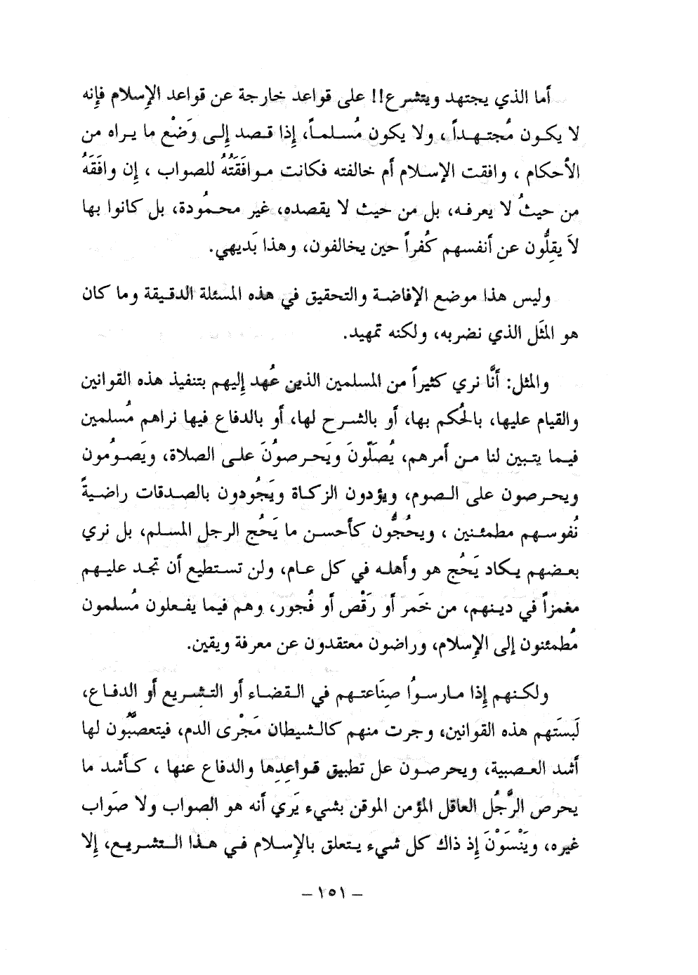 أما الذي يجتهد ويتشرع!! على قواعد خارجة عن قواعد الإسلام، فإنه لا يكون مجتهداً، ولا يكون مسلما، إذا قصد إلى وضع ما يراه من الأحكام، وافقت الإسلام أم خالفته، فكانت موافقته للصواب، إن وافقه من حيث لا يعرفه، بل من حيث لا يقصده، غير محمودة، بل كانوا بها لا يقلون عن أنفسهم كفراً حين يخالفون، وهذا بديهي.