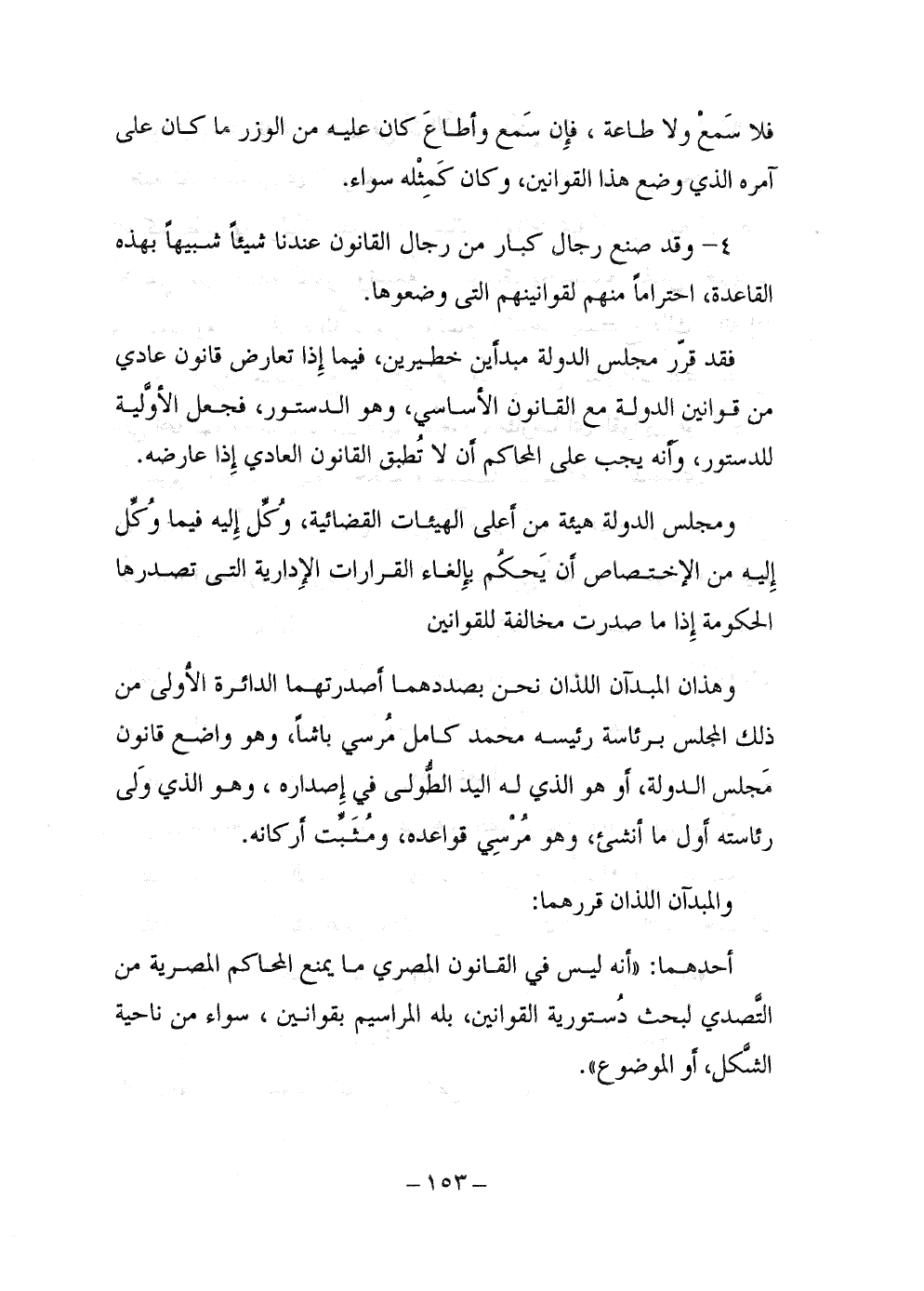 وهذان المبدآن اللذان نحن بصددهما أصدرتهما الدائرة الأولى من ذلك المجلس، برئاسة رئيسه محمد كامل مرسي باشا، وهو واضع قانون مجلس الدولة، أو هو الذي له اليد الطولى في إصداره، وهو الذي ولى رئاسته أول ما أُنشىء، وهو مرسي قواعده، ومثبت أركانه.