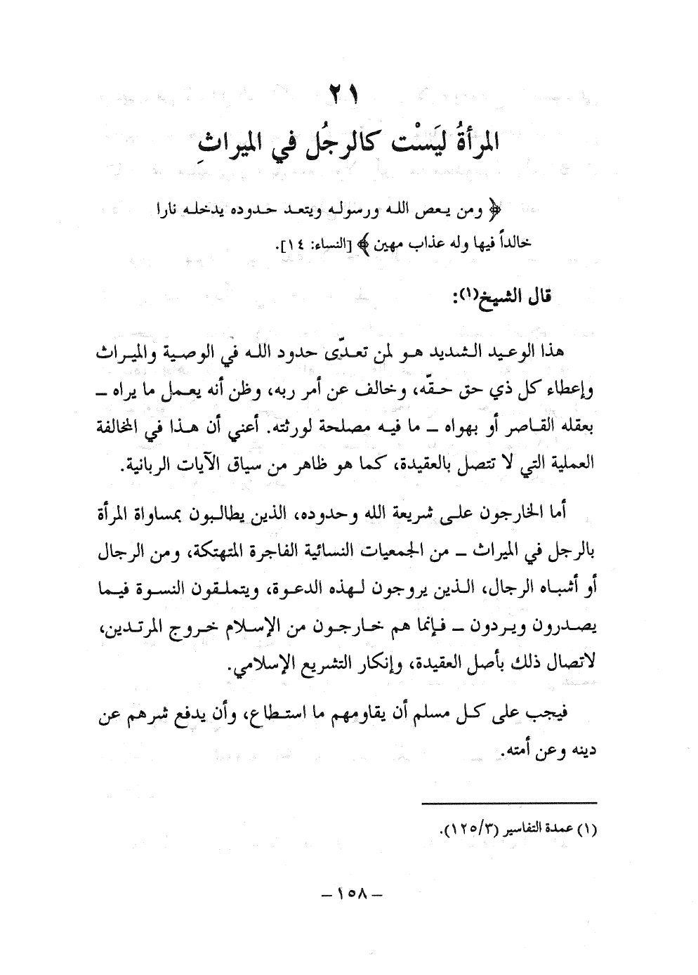 أما الخارجون على شريعة الله وحدوده، الذين يطالبون بمساواة المرأة بالرجل في الميراث -من الجمعيات النسائية الفاجرة المتهتكة، ومن الرجال أو أشباه الرجال، الذين يروجون لهذه الدعوة، ويتملقون النسوة فيما يصدرون ويردون- فإنما هم خارجون من الإسلام خروج المرتدين، لاتصال ذلك بأصل العقيدة، وإنكار التشريع الإسلامي.