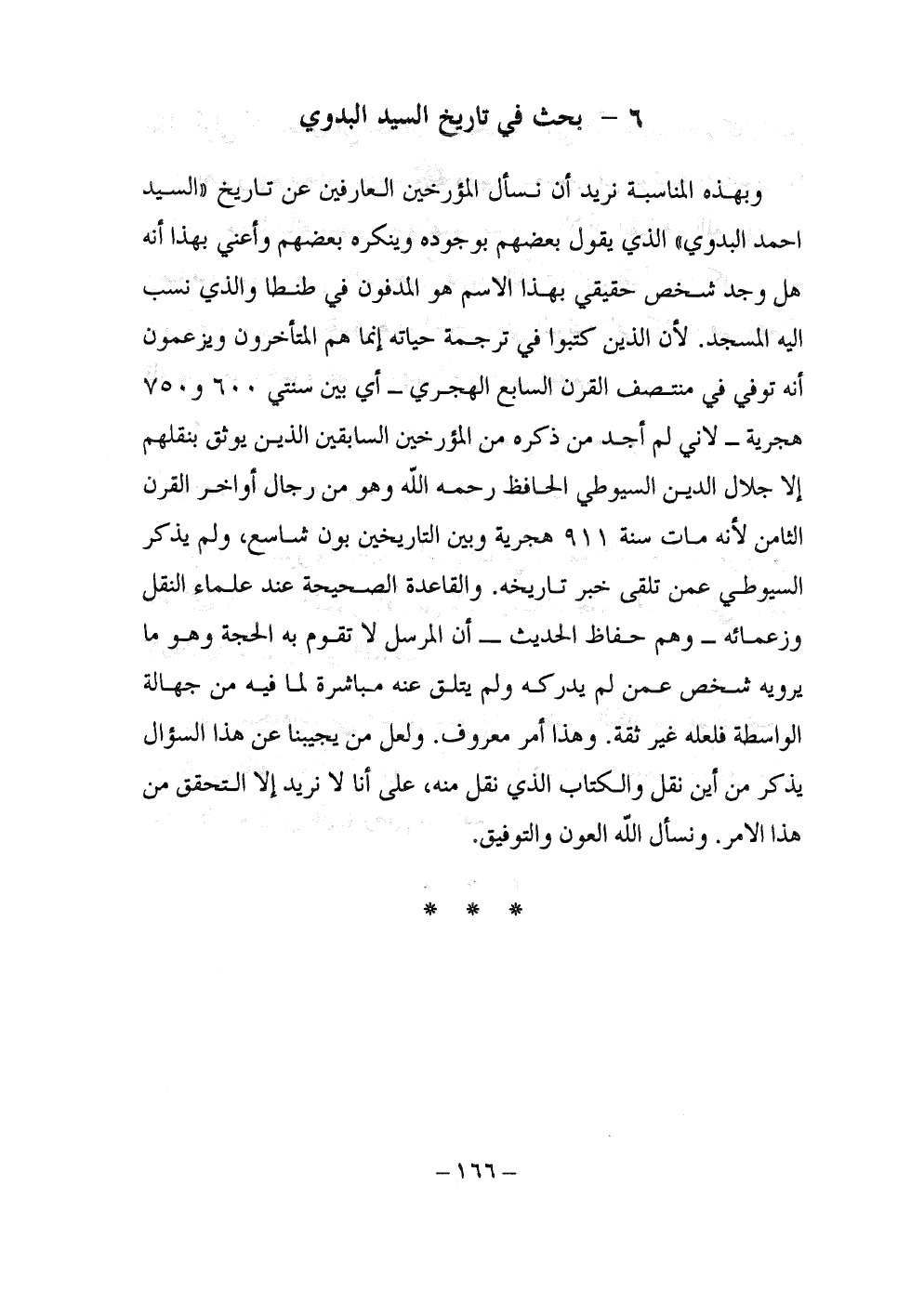 وبهذه المناسبة نريد أن نسأل المؤرخين العارفين عن تاريخ "السيد أحمد البدوي" الذي يقول بعضهم بوجوده وينكره بعضهم وأعني بهذا أنه هل وجد شخص حقيقي بهذا الاسم هو المدفون في طنطا والذي نسب إليه المسجد. لأن الذين كتبوا في ترجمة حياته إنما هم المتأخرون ويزعمون أنه توفي في منتصف القرن السابع الهجري -أي بين سنتي 600 و750 هجرية -لأني لم أحد من ذكره من المؤرخين السابقين الذين يوثق بنقلهم إلا جلال الدين السيوطي الحافظ -رحمه الله- وهو من رجال أواخر القرن الثامن لأنه مات سنة 911 هجرية وبين التاريخين بون شاسع، ولم يذكر السيوطي عمن تلقى خبر تاريخه. والقاعدة الصحيحة عند علماء النقل وزعمائه -وهم حفاظ الحديث- أن المرسل لا تقوم به الحجة وهو ما يرويه شخص عمن لم يدركه ولم يتلق عنه مباشرة لما فيه من جهالة الواسطة فلعله غير ثقة. وهذا أمر معروف. ولعل من يجيبنا عن هذا السؤال يذكر من أين نقل والكتاب الذي نقل منه، على أنا لا نريد إلا التحقق من هذا الأمر. ونسأل الله العون والتوفيق.