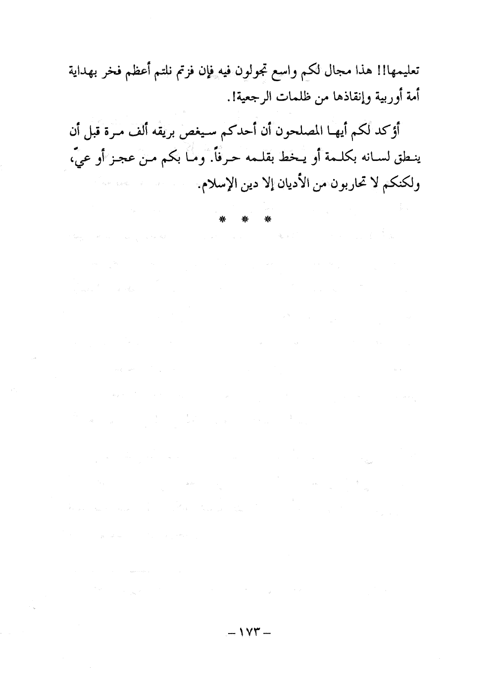 أؤكد لكم أيها المصلحون أن أحدكم سيغص بريقه ألف مرة قبل أن ينطق لسانه بكلمة أو يخط بقلمه حرفاً. وما بكم من عجز أو عيّ، ولكنكم لا تحاربون من الأديان إلا دين الإسلام.