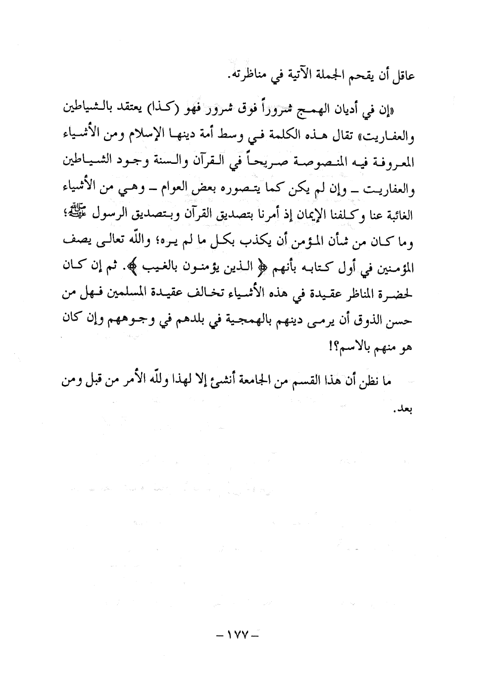 "إن في أديان الهمج شروراً فهو (كذا) يعتقد بالشياطين والعفاريت" تقال هذه الكلمة في وسط أمة دينها الإسلام ومن الأشياء المعروفة فيه المنصوصة صريحاً في القرآن والسنة وجود الشياطين والعفاريت- وإن لم يكن كما يتصوره بعض العوام- وهي من الأشياء الغائبة عنا وكلفنا الإيمان إذ أمرنا بتصديق القرآن وبتصديق الرسول صلى الله عليه وسلم؛ وما كان من شأن المؤمن أن يكذب بكل ما لم يره؛ والله تعالى يصف المؤمنين في أول كتابه بأنهم (الَّذِينَ يُؤْمِنُونَ بِالْغَيْبِ). ثم إن كان لحضرة المناظر عقيدة في هذه الأشياء تخالف عقيدة المسلمين فهل من حسن الذوق أن يرمى دينهم بالهمجية في بلدهم في وجوههم وإن كان هو منهم بالاسم؟!