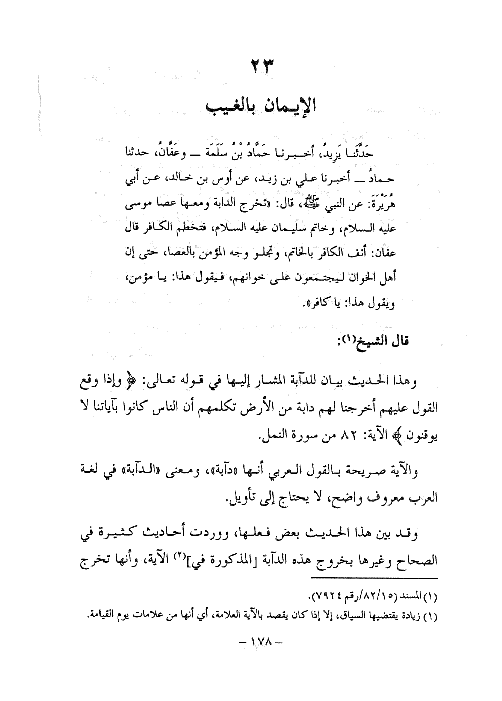 وهذا الحديث بيان للدآبة المشار إليها في قوله تعالى: (وَإِذَا وَقَعَ الْقَوْلُ عَلَيْهِمْ أَخْرَجْنَا لَهُمْ دَابَّةً مِّنَ الْأَرْضِ تُكَلِّمُهُمْ أَنَّ النَّاسَ كَانُوا بِآيَاتِنَا لَا يُوقِنُونَ) الآية:82 من سورة النمل.