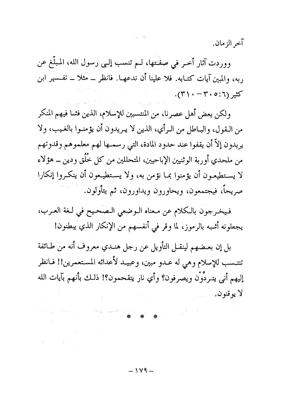 ولكن بعض أهل عصرنا، من المنتسبين للإسلام، الذين فشا فيهم المنكر من القول، والباطل من الرأي، الذين لا يريدون أن يؤمنوا بالغيب، ولا يريدون إلا أن يقفوا عند حدود المادة، التي رسمها لهم معلموهم وقدوتهم من ملحدي أوربة الوثنيين الإباحيين، المتحللين من كل خُلُق ودين -هؤلاء لا يستطيعون أن يؤمنوا بما نؤمن به، ولا يستطيعون أن ينكروا إنكارا صريحاً، فيجتمعون، ويحاورون ويداورون، ثم يتأولون.