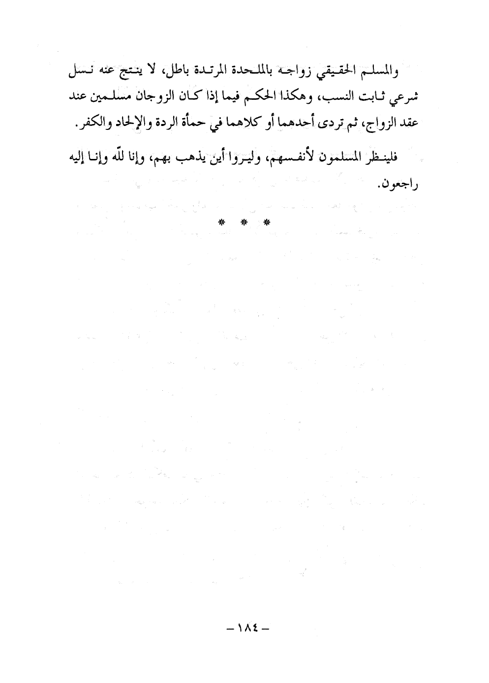 والمسلم الحقيقي زواجه بالملحدة المرتدة باطل، لا ينتج عنه نسل شرعي ثابت النسب، وهكذا الحكم فيما إذا كان الزوجان مسلمين عند عقد الزواج، ثم تردى أحدهما أو كلاهما في حمأة الردة والإلحاد والكفر.