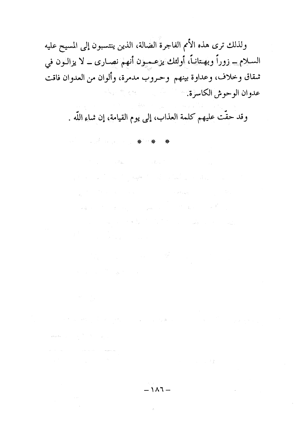 ولذلك ترى هذه الأمم الفاجرة الضالة، الذين ينتسبون إلى المسيح عليه السلام -زوراً وبهتاناً، أولئك يزعمون أنهم نصارى -لا يزالون في شقاق وخلاف، وعداوة بينهم، وحروب مدمرة، وألوان من العدوان فاقت عدوان الوحوش الكاسرة.