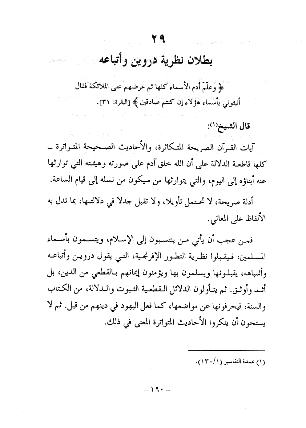 فمن عجب أن يأتي من ينتسبون إلى الإسلام، ويتسمون بأسماء المسلمين، فيقبلوا نظرية التطور الإفرنجية، التي يقول دروين وأتباعه وأشباهه، يقبلونها ويسلمون بها، ويؤمنون إيمانهم بالقطعي من الدين، بل أشد وأوثق. ثم يتأولون الدلائل القطعية الثبوت والدلالة، من الكتاب والسنة، فيحرفونها عن مواضعها، كما فعل اليهود في دينهم من قبل. ثم لا يستحون أن ينكروا الأحاديث المتواترة المعنى في ذلك.