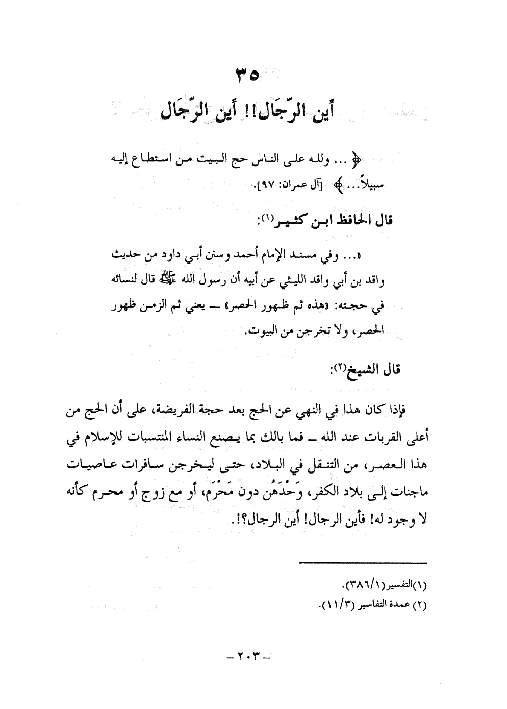 فإذا كان هذا في النهي عن الحج بعد حجة الفريضة، على أن الحج من أعلى القربات عند الله -فما بالك بما يصنع النساء المنتسبات للإسلام في هذا العصر، من التنقل في البلاد، حتى ليخرجن سافرات عاصيات ماجنات إلى بلاد الكفر، وحدهن دون محرم، أو مع زوج أو محرم كأنه لا وجود له! فأين الرجال! أين الرجال؟!.