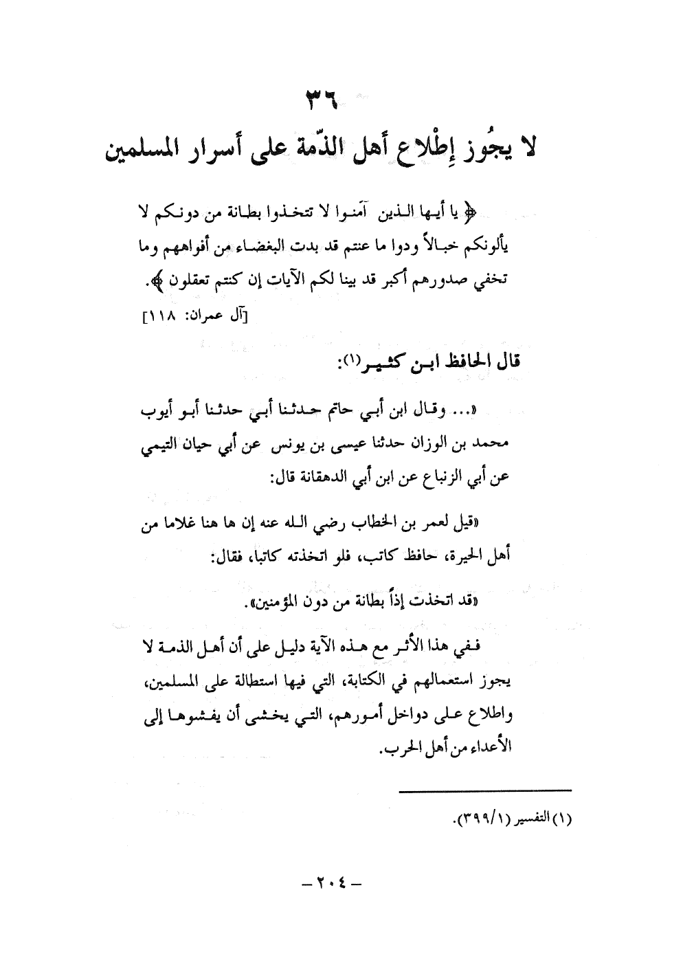 ففي هذا الأثر مع هذه الآية دليل على أن أهل الذمة لا يجوز استعمالهم في الكتابة، التي فيها استطالة على المسلمين، واطلاع على دواخل أمورهم، التي يخشى أن يفشوها إلى الأعداء من أهل الحرب.