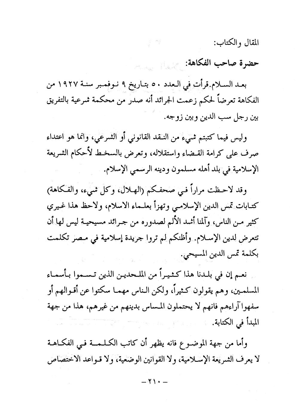 وقد لاحظت مراراً في صحفكم (الهلال، وكل شيء، والفكاهة) كتابات تمس الدين الإسلامي وتهزأ بعلماء الإسلام، ولاحظ هذا غيري كثير من الناس، وآلمنا أشد الألم لصدوره من جرائد مسيحية ليس لها أن تتعرض لدين الإسلام. وأظنكم لم تروا جريدة إسلامية في مصر تكلمت بكلمة تمس الدين المسيحي.
